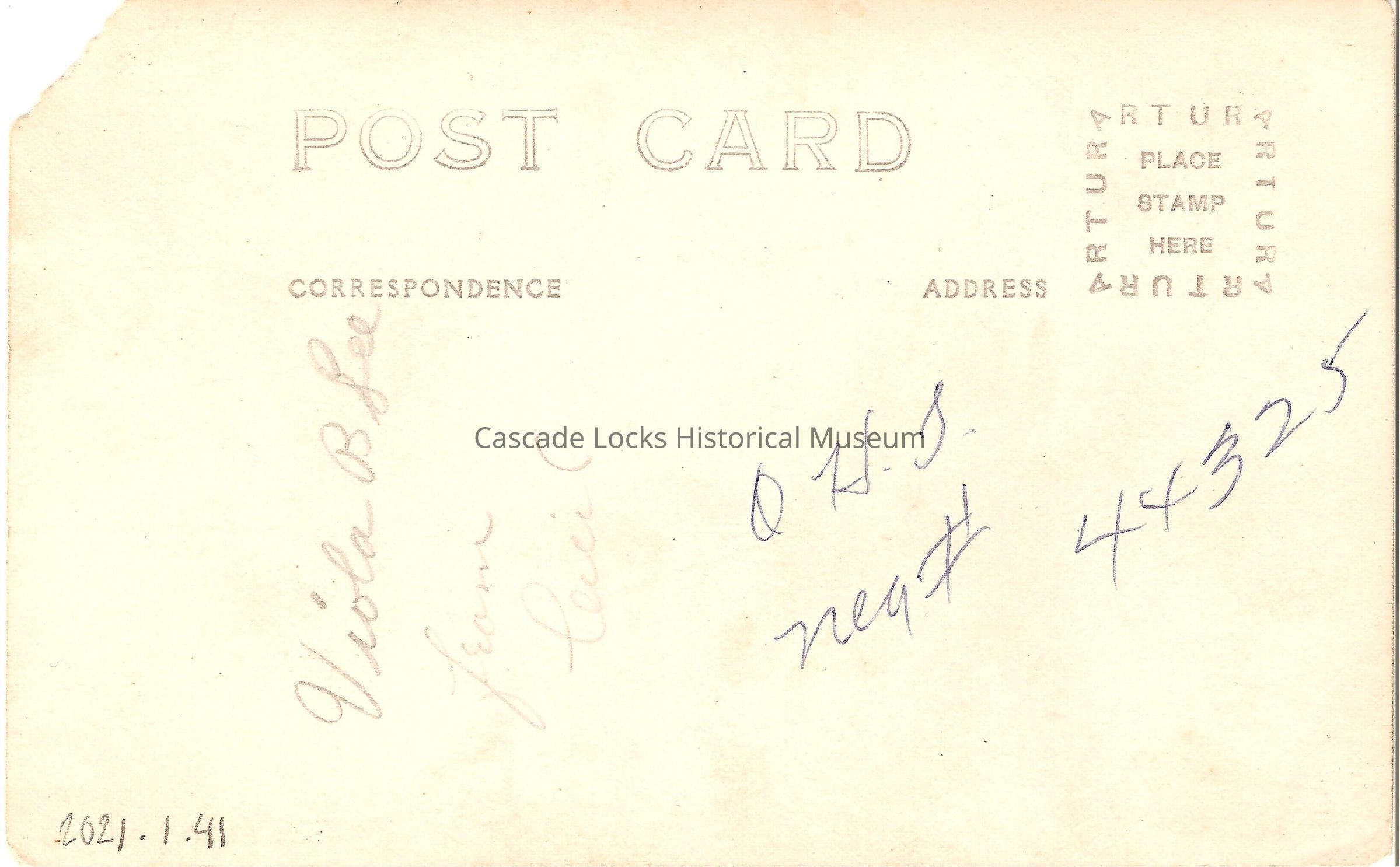 Back of image reads, "Post Card. Correspondence- Viola B Lee, From Lacil. Address. Place Stamp Here, Athur. (Written) O.H.S. Neg #44325."Lexicon