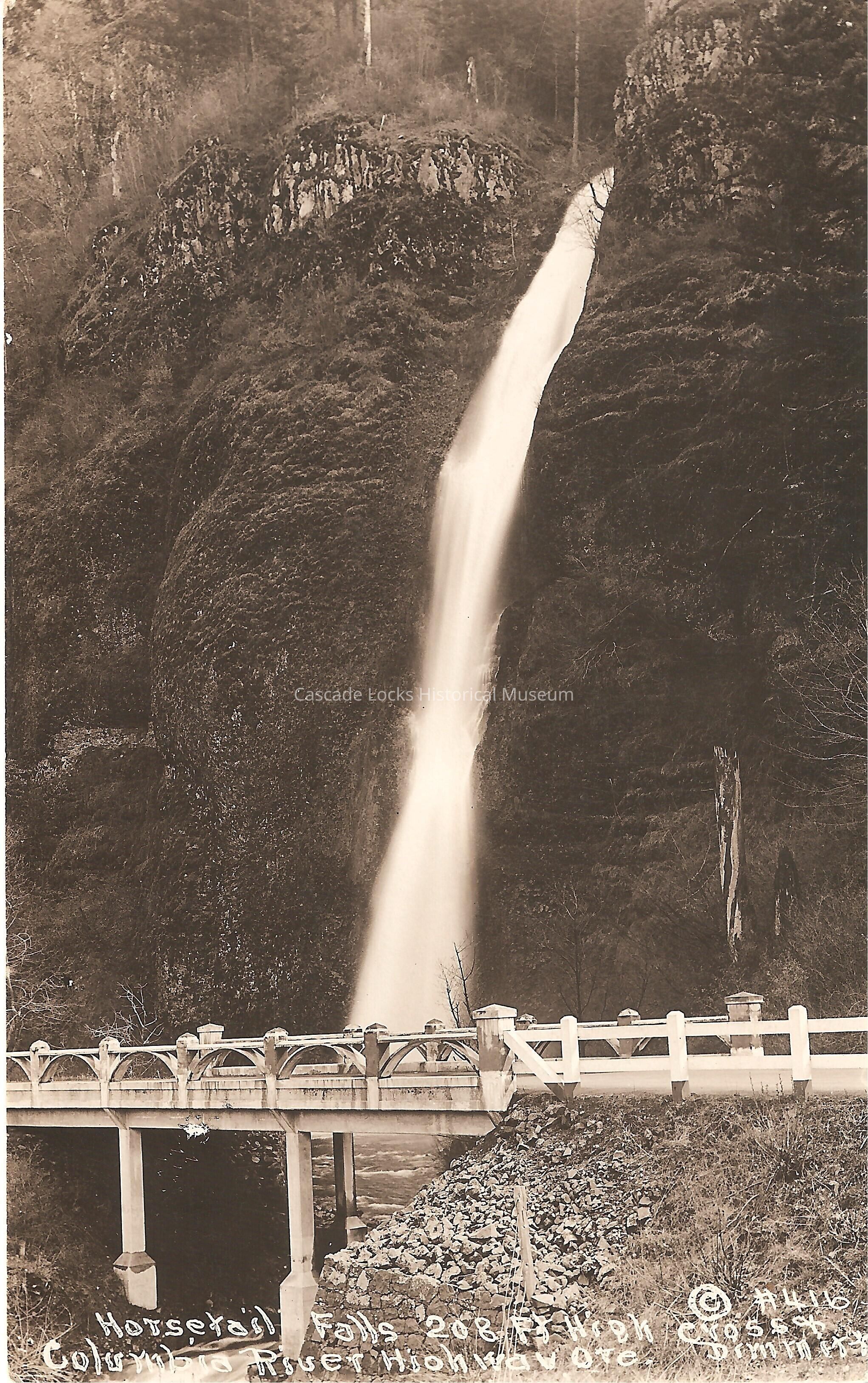Postcard, image of the Horsetail Falls on the Columbia River Highway. Card reads, "Horsetail Falls 208 Ft High, Columbia River highway, Ore. #416. Cross & Dimmitt."