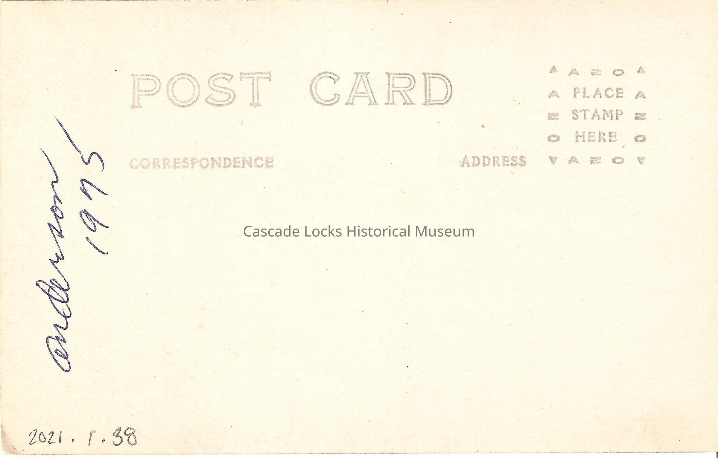 Back of image reads, "Post Card. Correspondence. Address. Place Stamp Here, AZO. (Signed) Anderson 1975."Lexicon