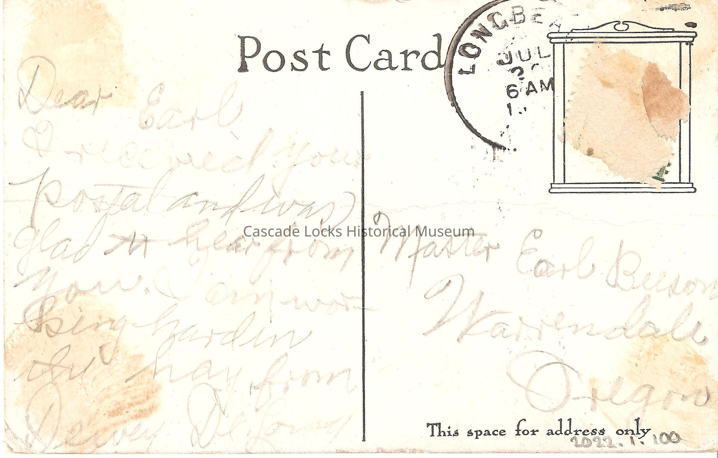 Back of image reads, "Post Card. Dear Earl, I received your postal and was glad to heat from you. I am working hard in the hay, From Devey De Lovey. This space for Address only- Master Earl Buson, Warrendale, Oregon. Long Beach, Wash. Jul 20, 6AM, 19(?)."Lexicon