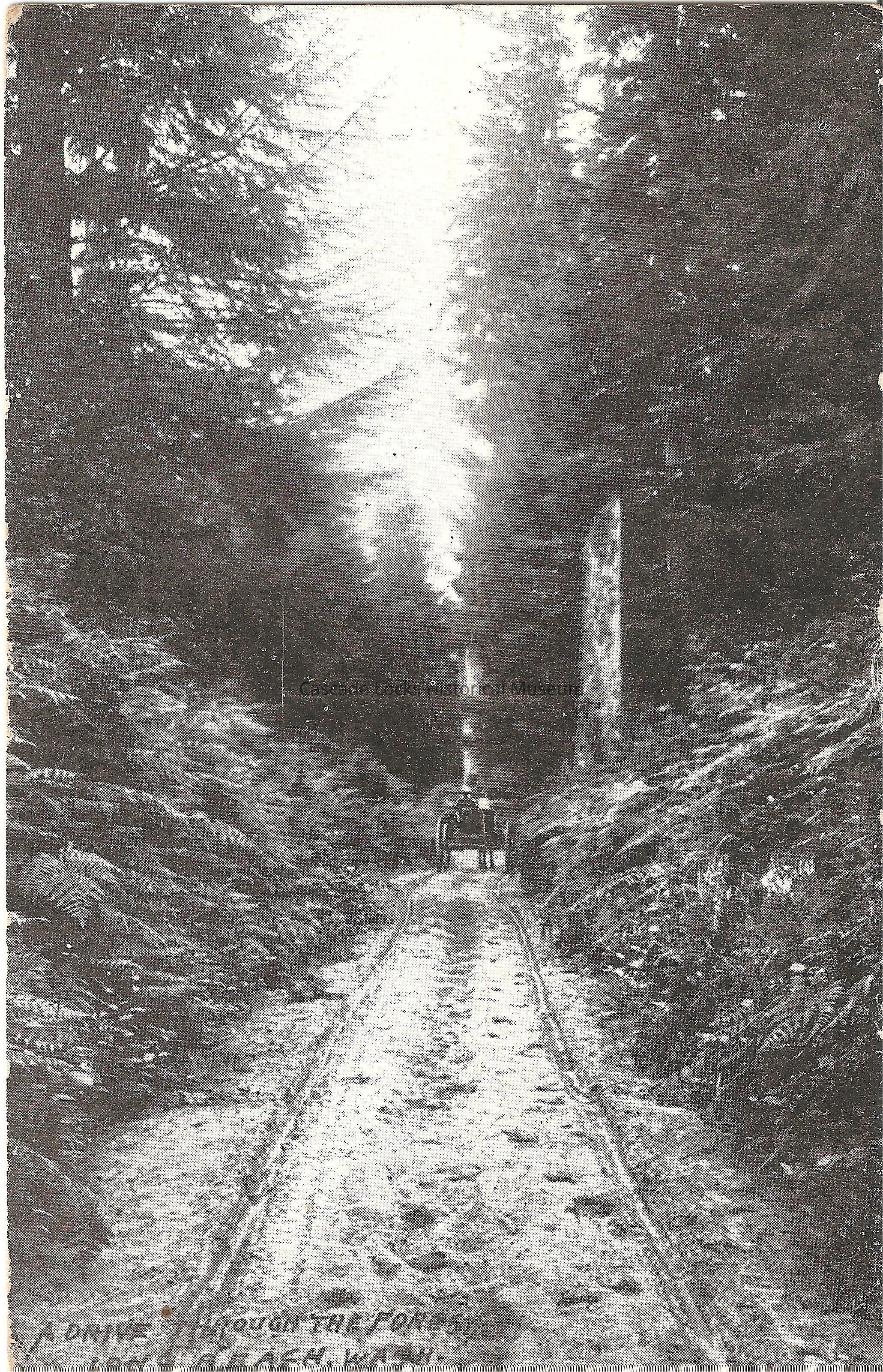 Postcard, image of a car driving through the forest in Long Beach, Washington. Base of image reads, "A Drive Through The Forest, Long Beach, Wash."