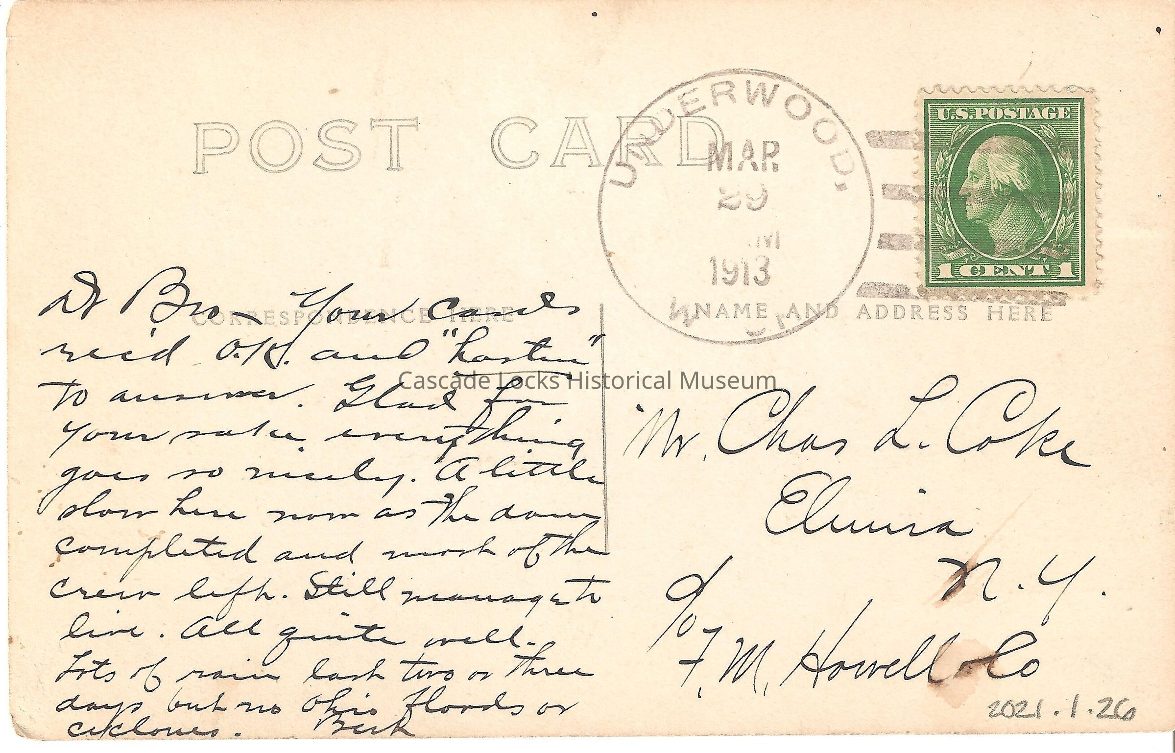 Back of image reads, "Post Card. Correspondence- Dear Bro, your card received O.K. and "(?)" to answer. glad for your sake everything goes so nicely. A little slow here now as the dam completed an much of the crew left. Still (?). All quite well. Lots of rain last two or three days but no Ohio floods or cyclones. -Bert. Name And Address Here- Mr. Chas L. Cake, Elmira N.Y. c/o F. M. Howell Co. Underwood, Wash. Mar 29, 1913. U.S. Postage, 1 Cent."Lexicon