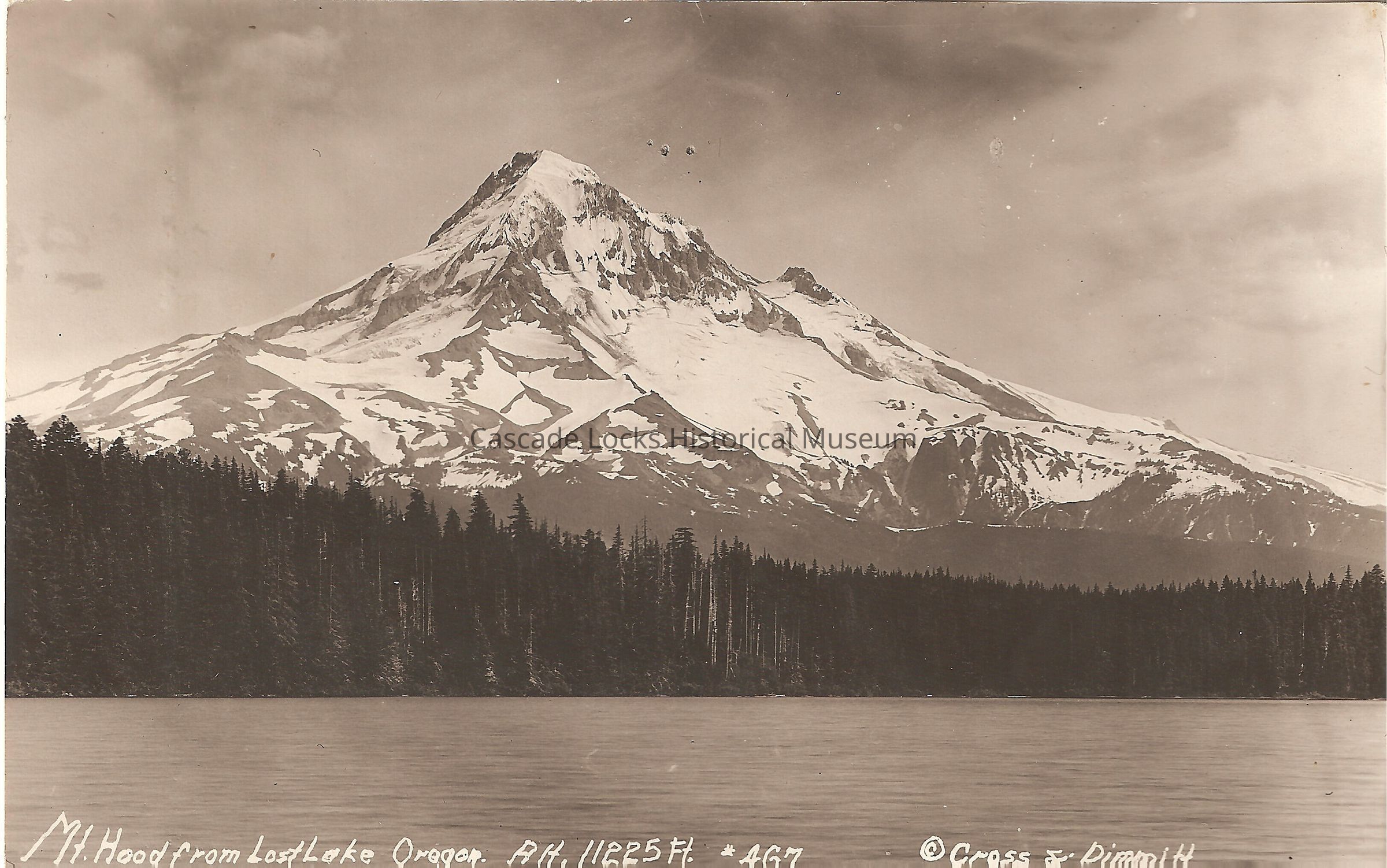 Postcard, image of the Mt. Hood from Lost Lake. Card reads, "Mt. Hood from Lost Lake, Oregon. RH. 112225Ft.#4G7. Cross & Dimmitt."