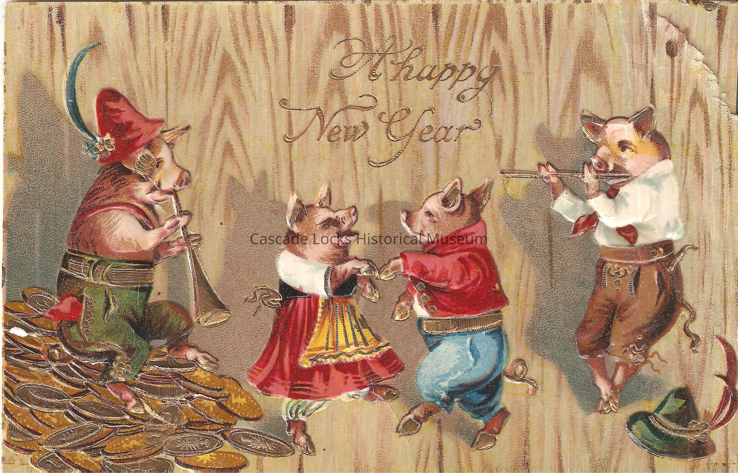 Post Card, illustrated image of four pigs dancing wearing traditional German style clothing. One pig is sitting on a large pile of money. The background of the image looks like wood. The upper middle of the picture reads, "Happy New Year."