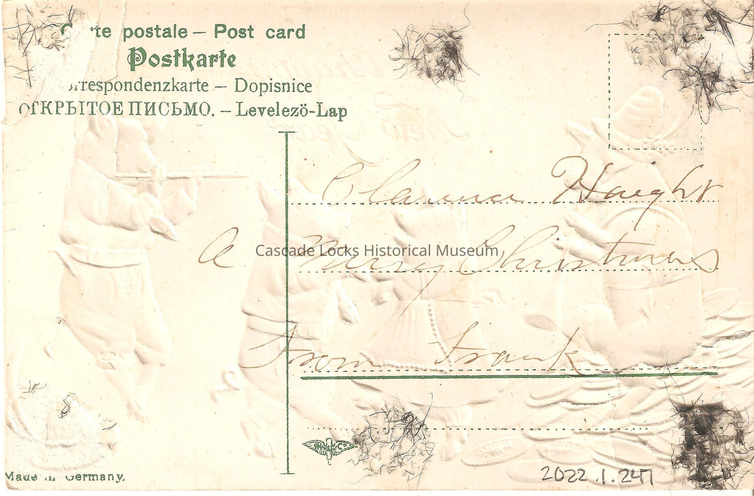 Back of image reads," 'te postale- Post card, Postkarte, correspondenzkarte- Dopisnice Otkplitoe Iinclmo- Levelezo-Lap. Made in Germany. Clarence Haight, A Merry Christmas, From Frank" There is a symbol with an eagle.Lexicon