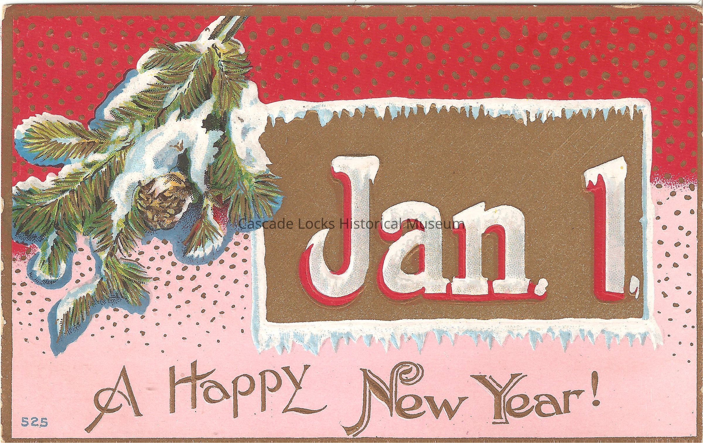 Post Card, illustrated image of a pine tree branch with pine cones and snow. Top of the card is red and the bottom is pink. Postcard reads; "Jan, 1" with snow covering. The front base of the image reads, "A Happy New Year!"