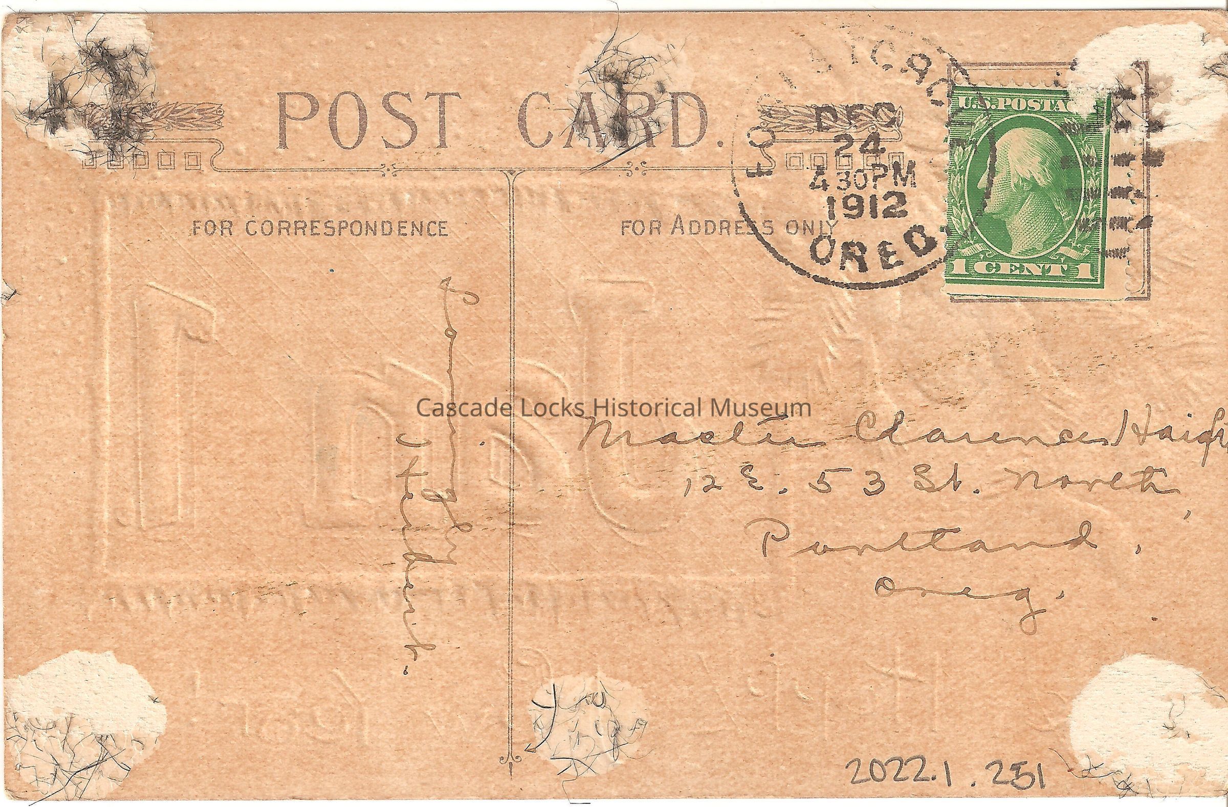 Back of image reads, "Post Card, For Correspondence- (?), Herbert, For Address Only- Master Clarence Haight 12 E. 53rd St. North. Portland, Oreg. Fori5tcacye, Dec 24 430 PM 1912, Oreg. U.S. Postage 1 Cent (Stamp)"Lexicon