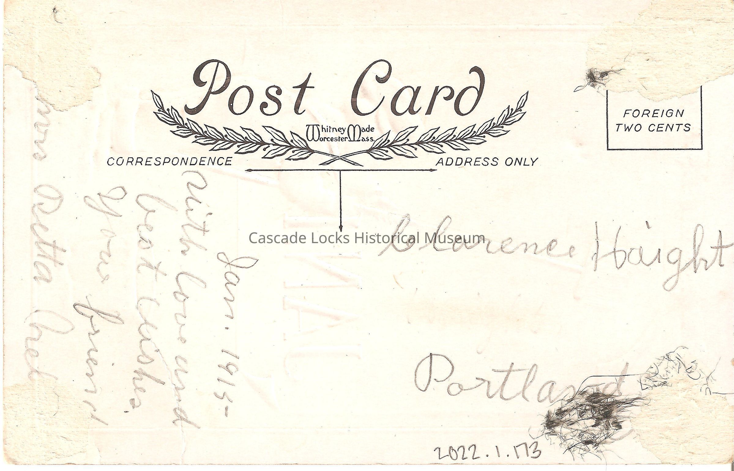 Back of image reads, "Post Card. Correspondence- Jan 1915, With love and best wishes, your friends Mrs. Retta Heb(?). Address Only- Clarence Haight Portland. Whitney Made Worchester Mass. Foreign Two Cents."Lexicon