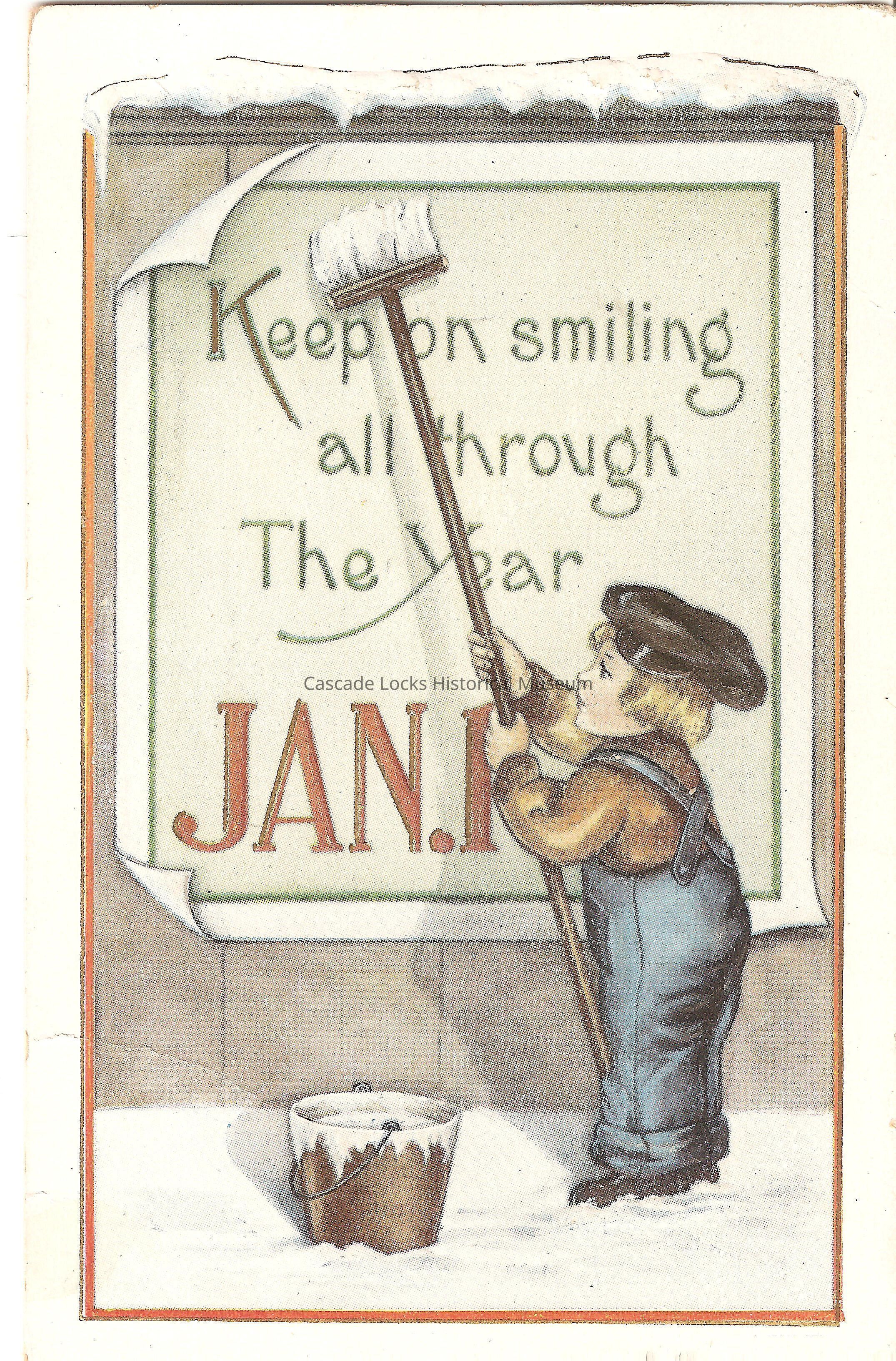 Post Card, illustrated image of a young child applying adhesive to a large poster that reads, "Keep on smiling all through The Year. Jan .1"