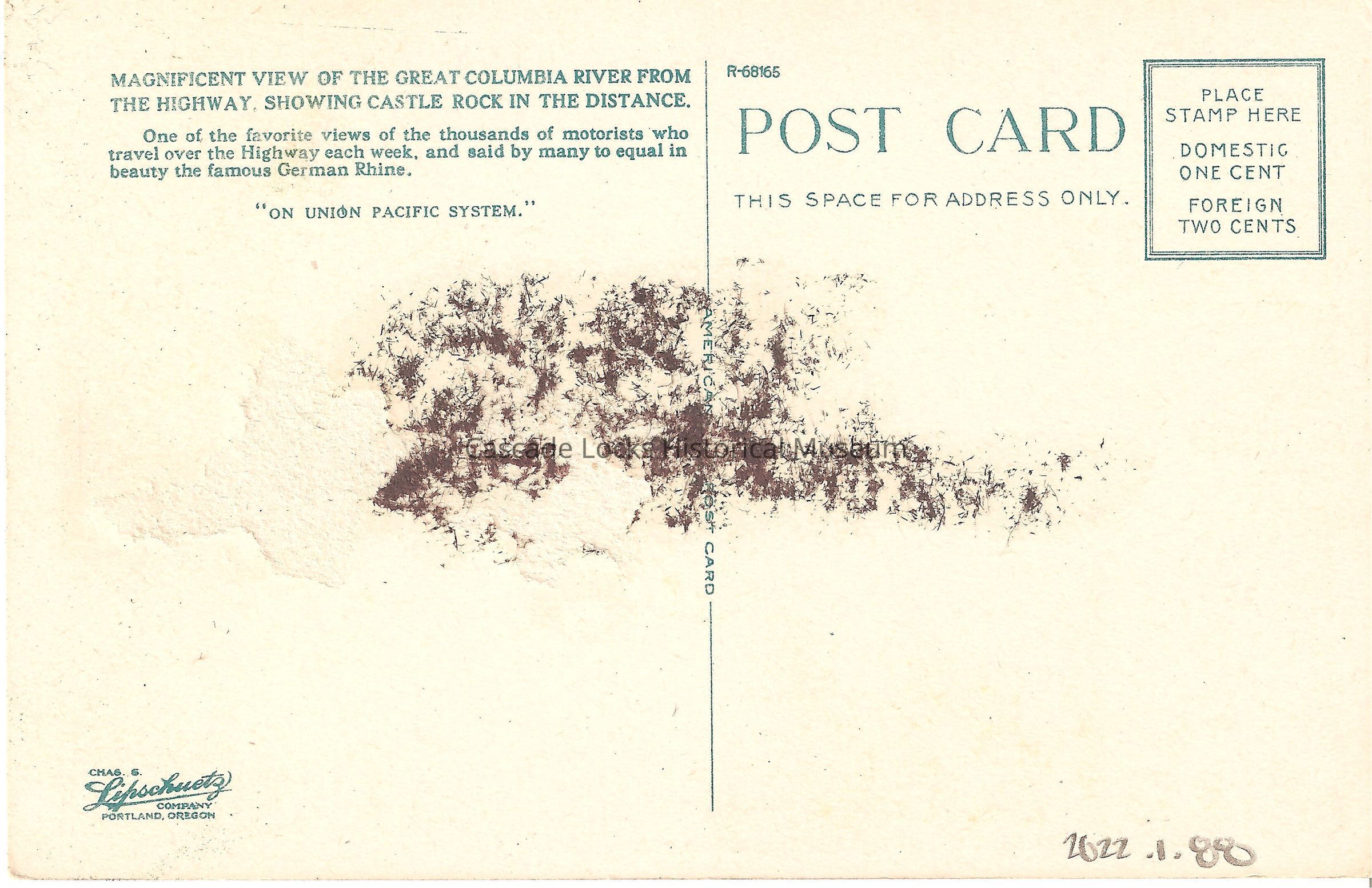 Back of image reads, "Post Card. Magnificent View Of The Great Columbia River From The Highway, Showing Castle Rock In The Distance. One of the favorite views of the thousand of motorists who travel over the Highway each week, and sid by many to equal in beauty the famous German Rhine. "On Union Pacific system." This space for Address only- American Art Post Card. Chas S. Lipschuetz Company, Portland, Oregon. R-68165. Place Stamp Here, domestic One Cent, Foreign Two Cents."Lexicon