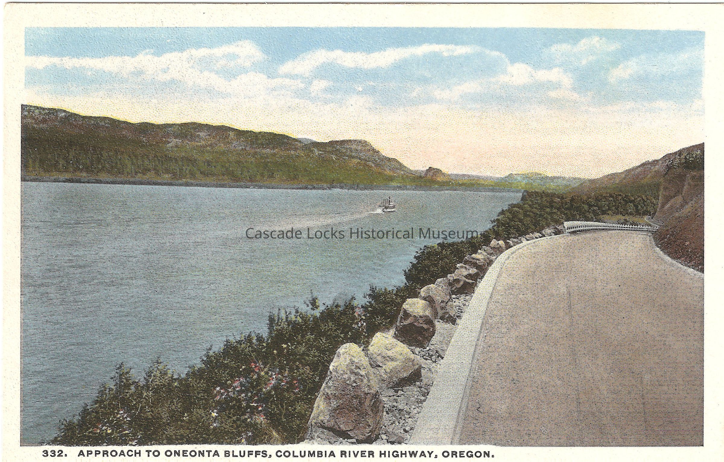 Postcard, image of the Oneonta Bluffs from the Columbia River Highway. Card reads, "322. Approach to Oneonta Bluffs, Columbia River Highway, Oregon."