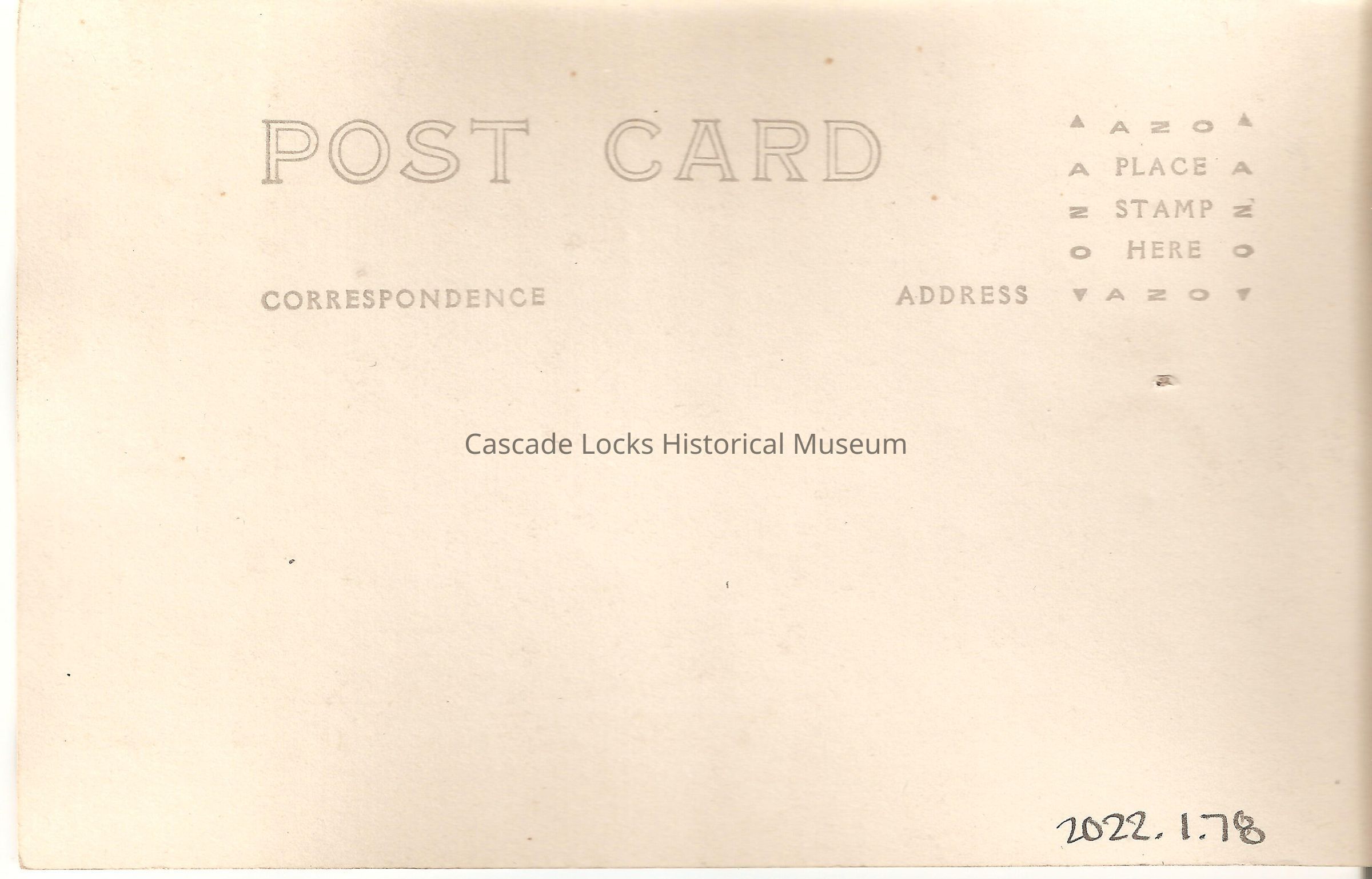 Back of image reads, "Post Card. Correspondence. Address. Place Stamp Here, AZO."Lexicon