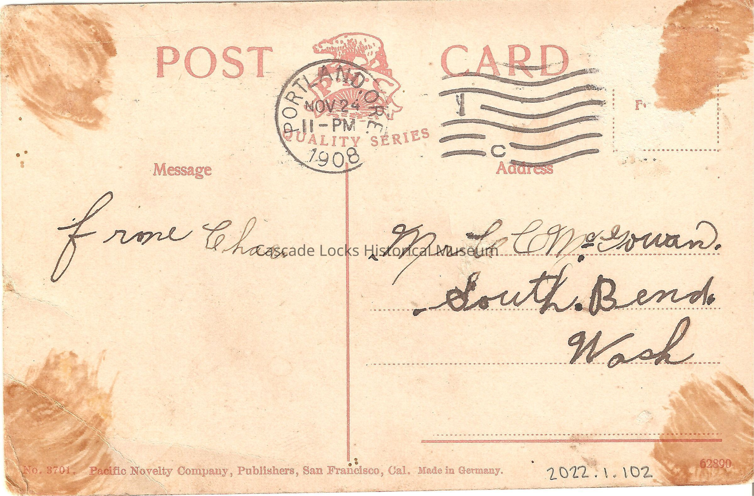Back of image reads, "Post Card. Message- From Chas. Address- Mr. C.C.M. Gowan. South Bend, Wash. No. 3701. Pacific Novelty Company, Publishers, San Fancisco, Cal. 62890. Made in Germany. P.N.C. Quality Series. Portland, Ore. Nov 24, 11PM, 1908."Lexicon