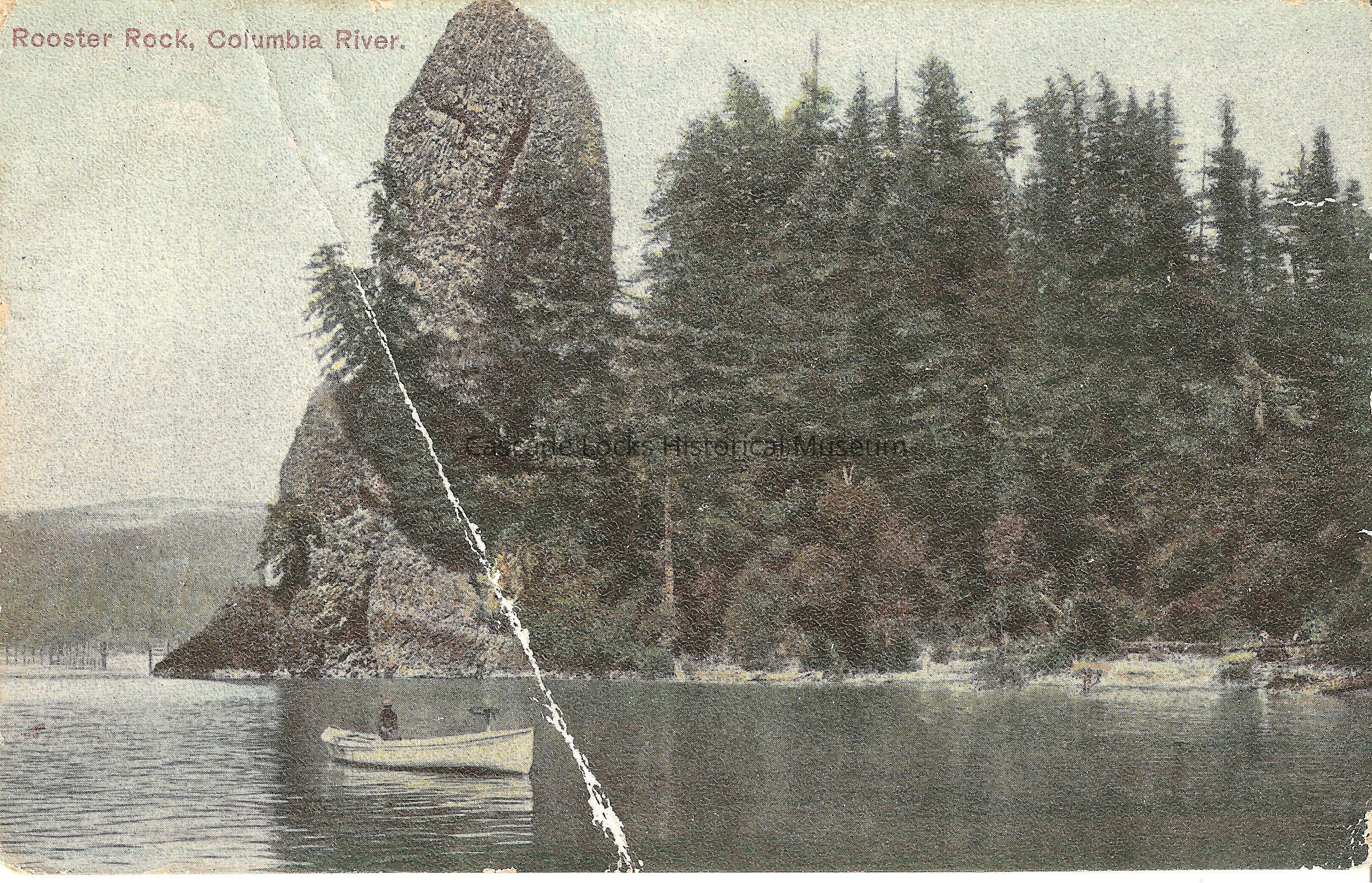 Postcard, image of Rooster Rock. Card reads, "Rooster Rock, Columbia River."