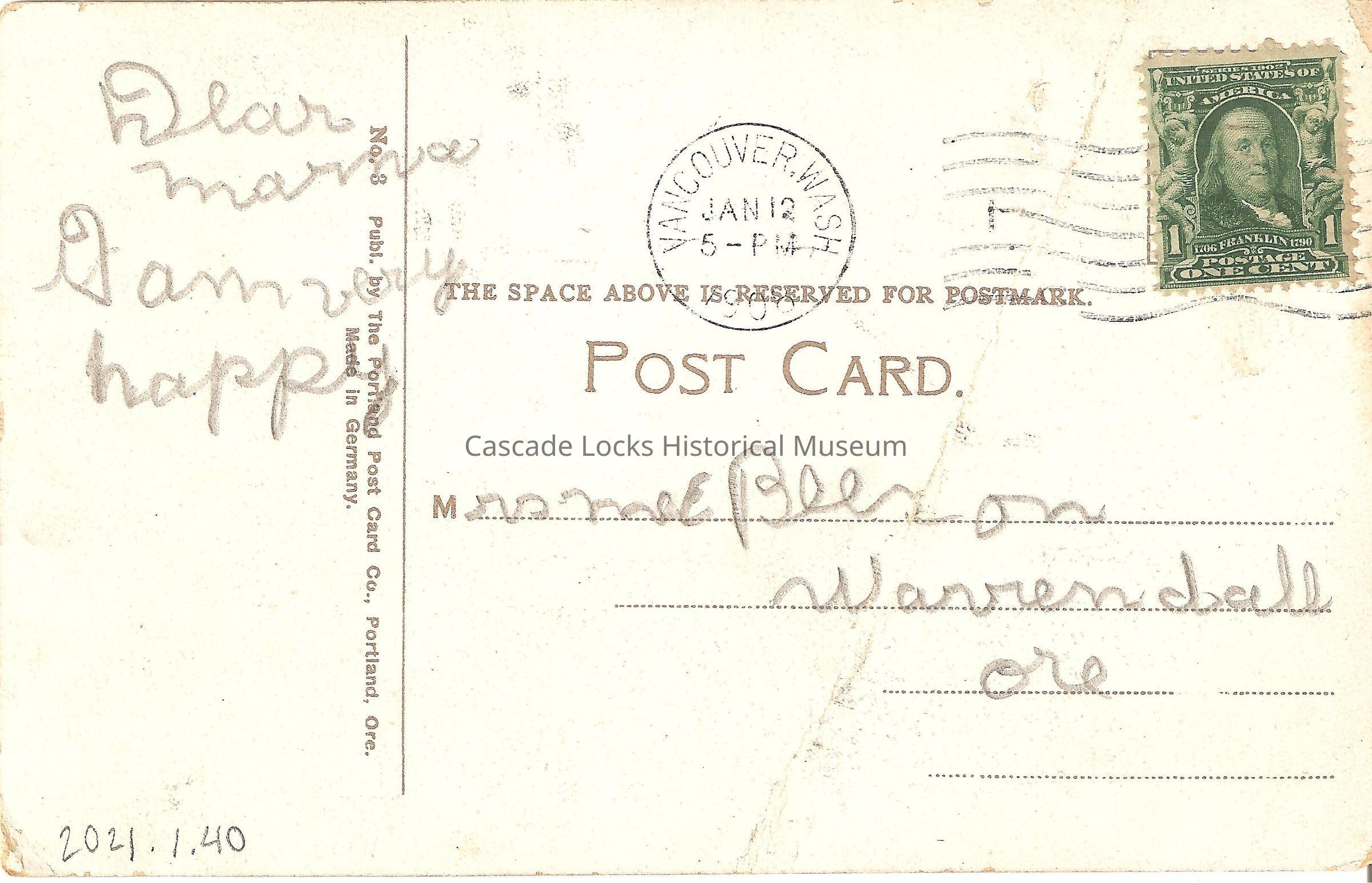 Back of image reads, "Post Card. Correspondence- Dear Mama, I am very Happy. The Space above Is Reserved For Postmark- Mrs Mae Buson, Warrendale, Ore. No. 8 Publ. by The Portland Post Card Co., Portland, Ore. Made in Germany. Vancouver, Wash. Jan 12, 5PM, 1908. United States of America 1706-1790 Franklin, Postage One Cent (Stamp)."Lexicon