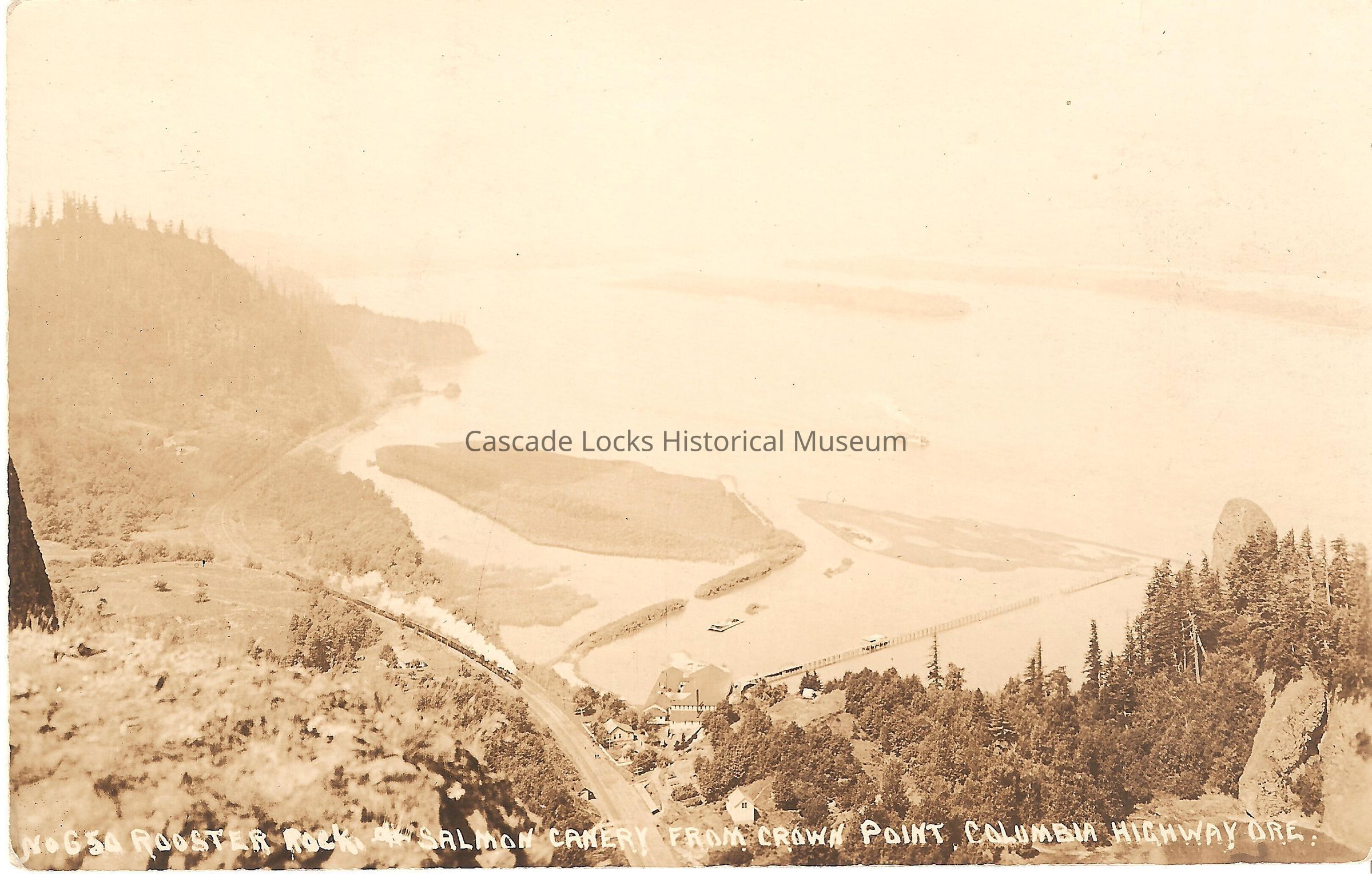 Postcard, image of Rooster Rock and a Salmon Cannery taken from Crown Point and the Columbia River Highway. Card reads, "No. 650. Rooster Rock & Salmon Canery from Crown point, Columbia Highway, Ore."