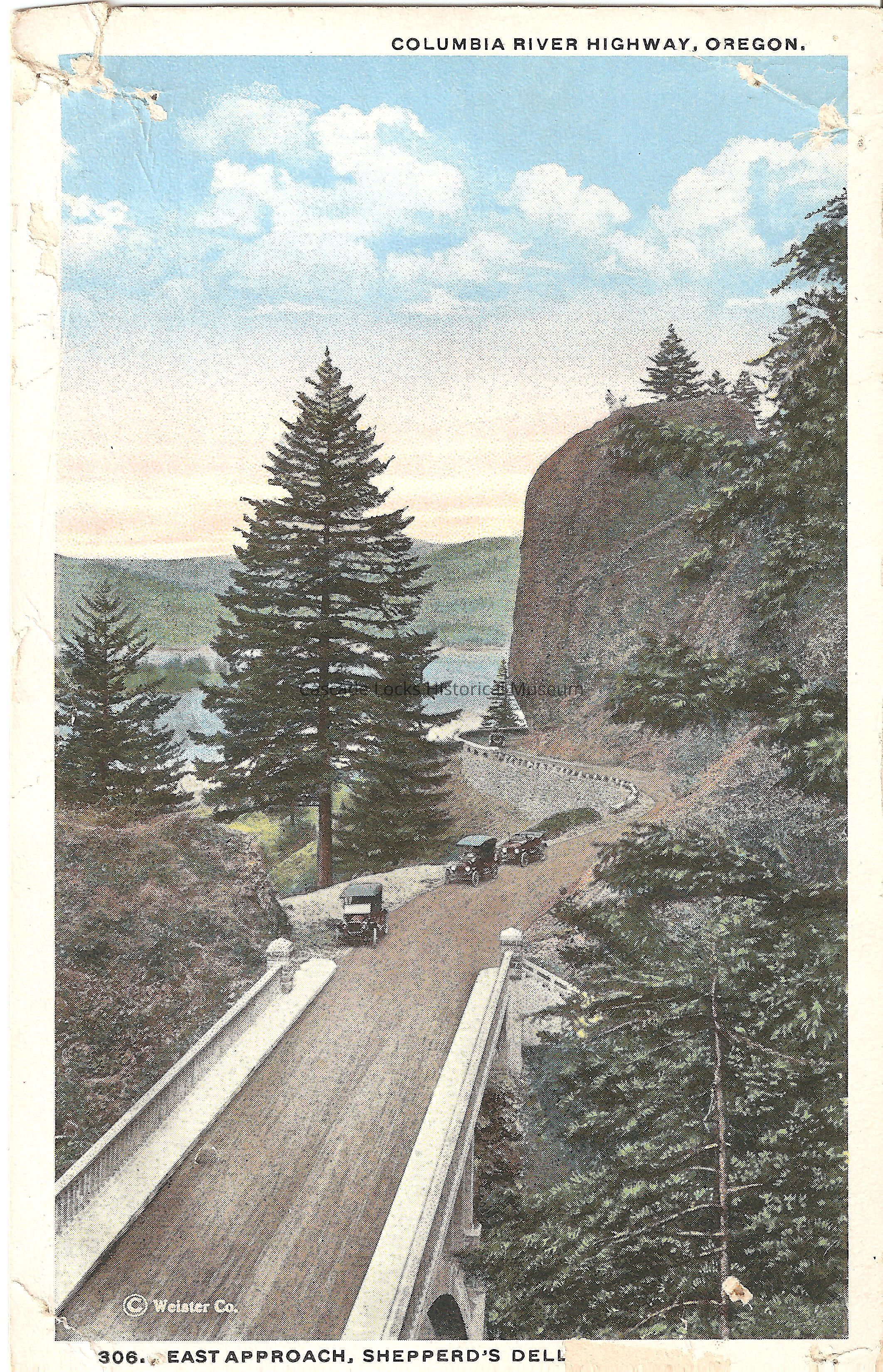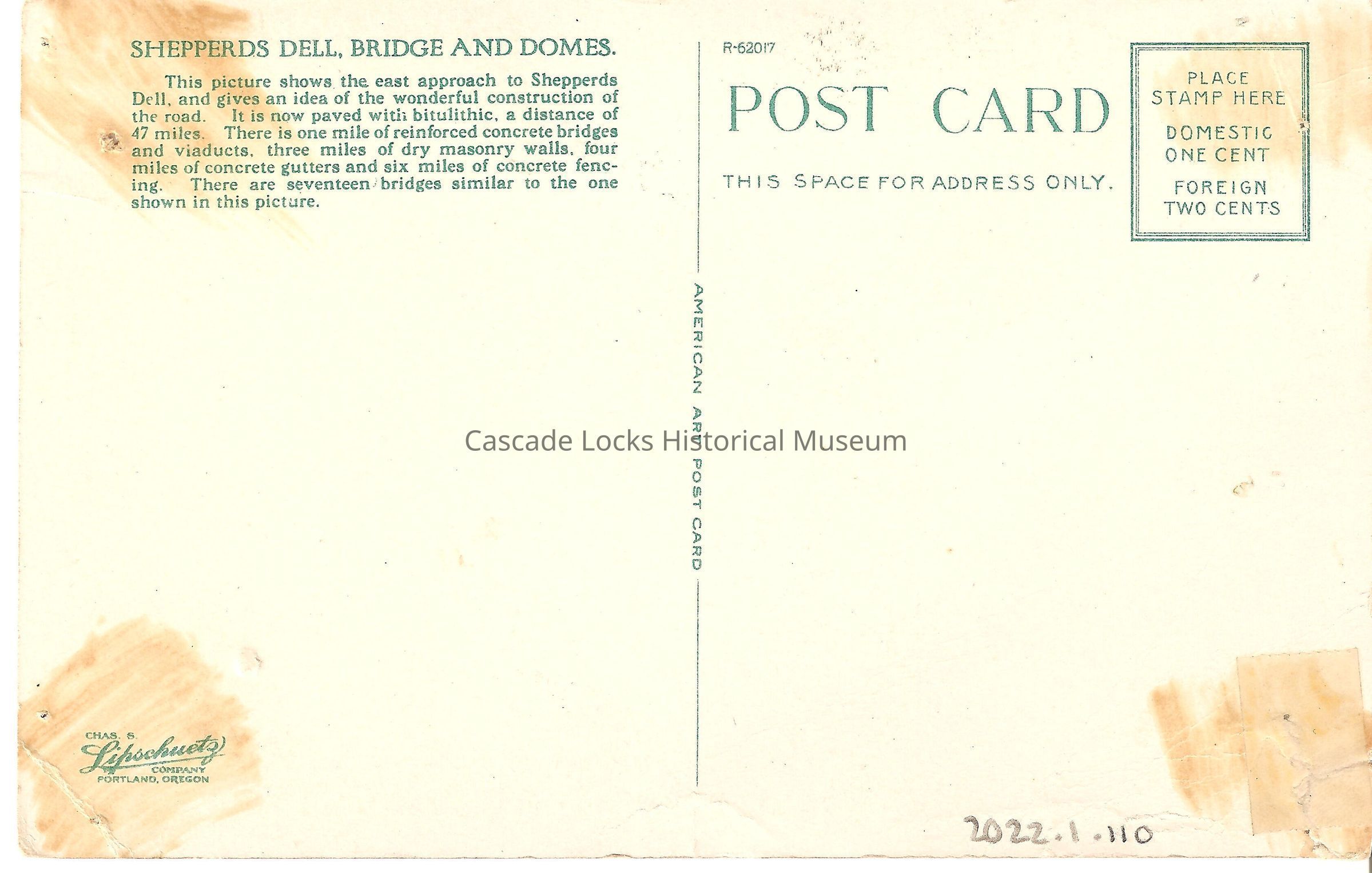 Back of image reads, "Post Card. Sheppred's Dell, Bridge and domes. This picture shows the east approach to Shepperd's Dell, and gives an idea of the wonderful construction of the road. There is now paved with bitulithic, a distance of 47 miles. There is one mile of reinforced concrete bridges and viaducts, three miles of dry masonry walls, four miles of concrete gutters and six miles of concrete fencing. There are seventeen bridges similar to the one shown in this picture. Chas. S. Lipschuetz Company. Portland, Oregon. American Art Post Card. R-62017. This Space For Address Only. Place Stamp Here, Domestic One Cent, Foreign Two Cents."Lexicon