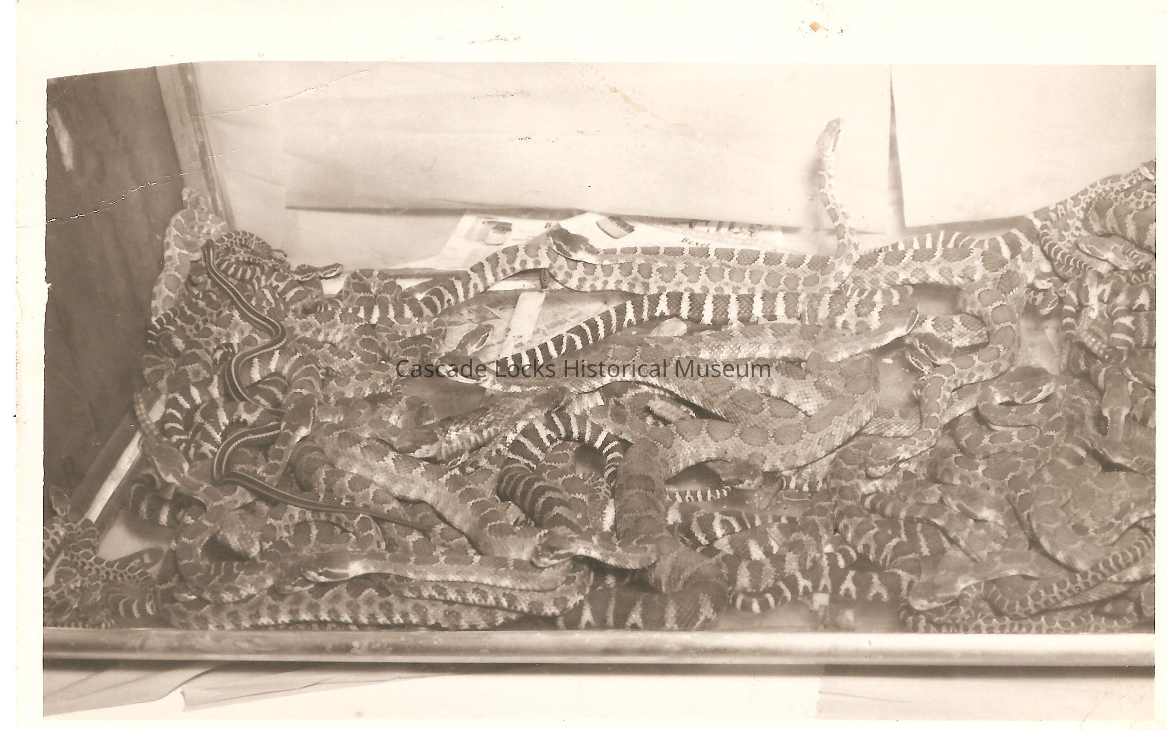 Postcard, photograph image of a mound of snakes in a enclosure. There are Northern Pacific Rattlesnakes, Striped Whipsnake, and Western Rattlesnake, in the image along with various other snakes.