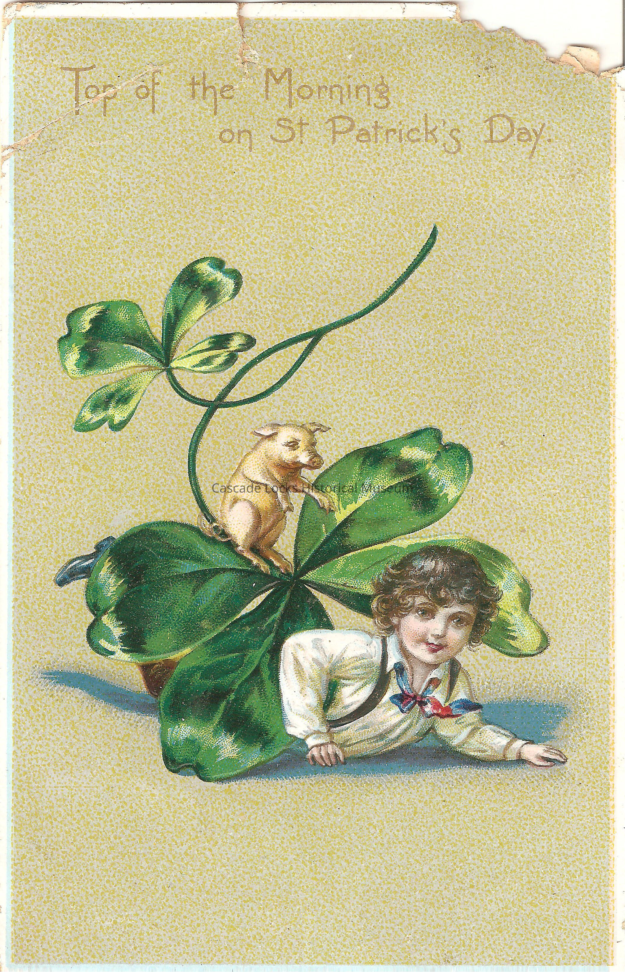 Post Card, illustrated image of a young child under a set of four leaf clovers with a pig standing on top of them. The top of the card reads, "Top of the Morning on St. Patrick's Day."
