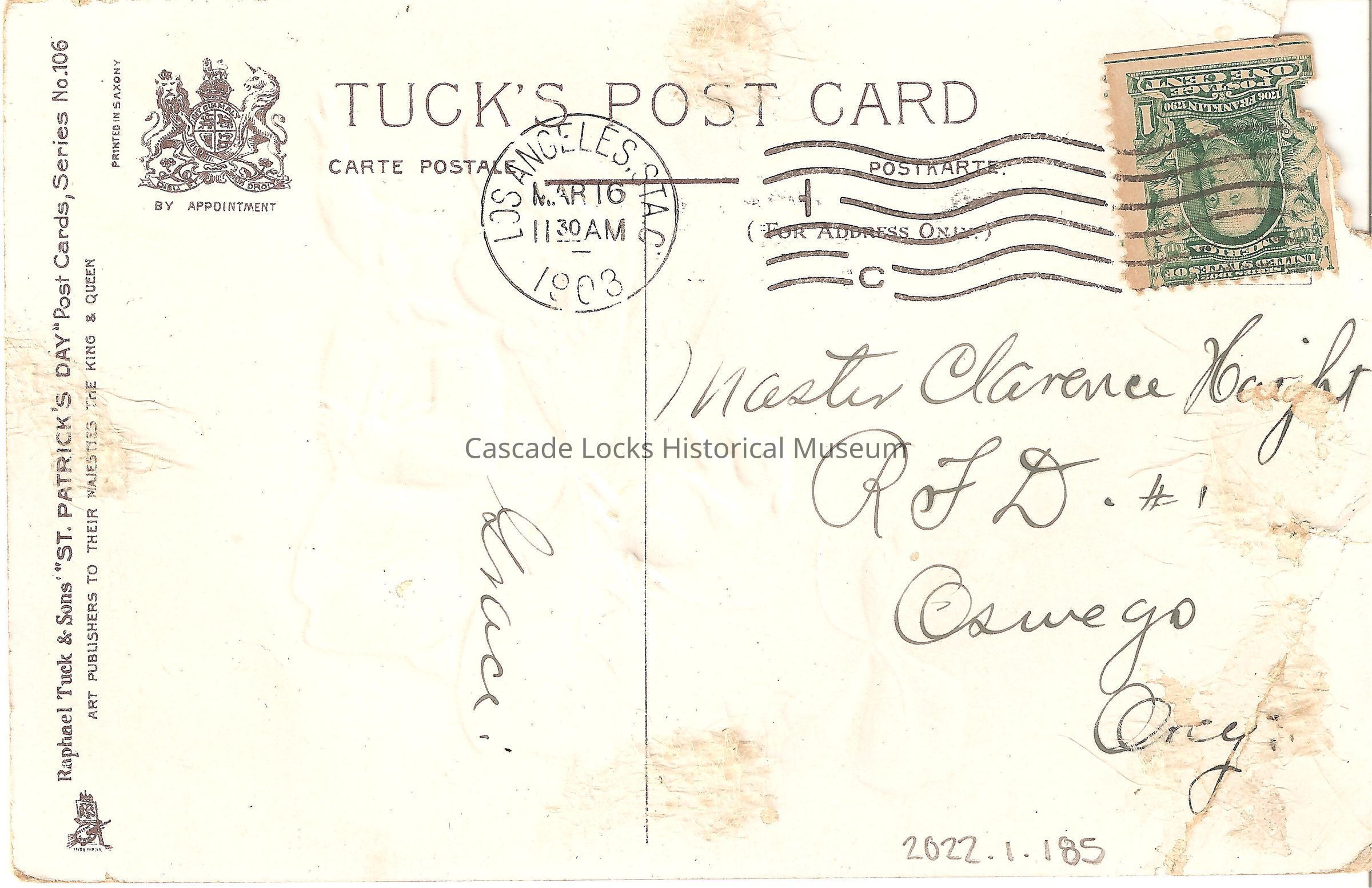 Back of image reads, "Tuck's Post Card, Carte Postale, Postkarte, Raphael Tuck & Sons' "St. Patrick's Day" Post Card, Series No. 106. Art Publishers to their Majesties the King and Queen. Printed in Saxony (Germany). By Appointment. Grace. For Address Only- Master Clarence Haight, R.F.D. #1, Oswego, Oreg. Los Angeles, STA C. Mar 16, 1130AM, 1903. United States of America 1706-1790 Franklin, Postage One Cent (Stamp)"Lexicon
