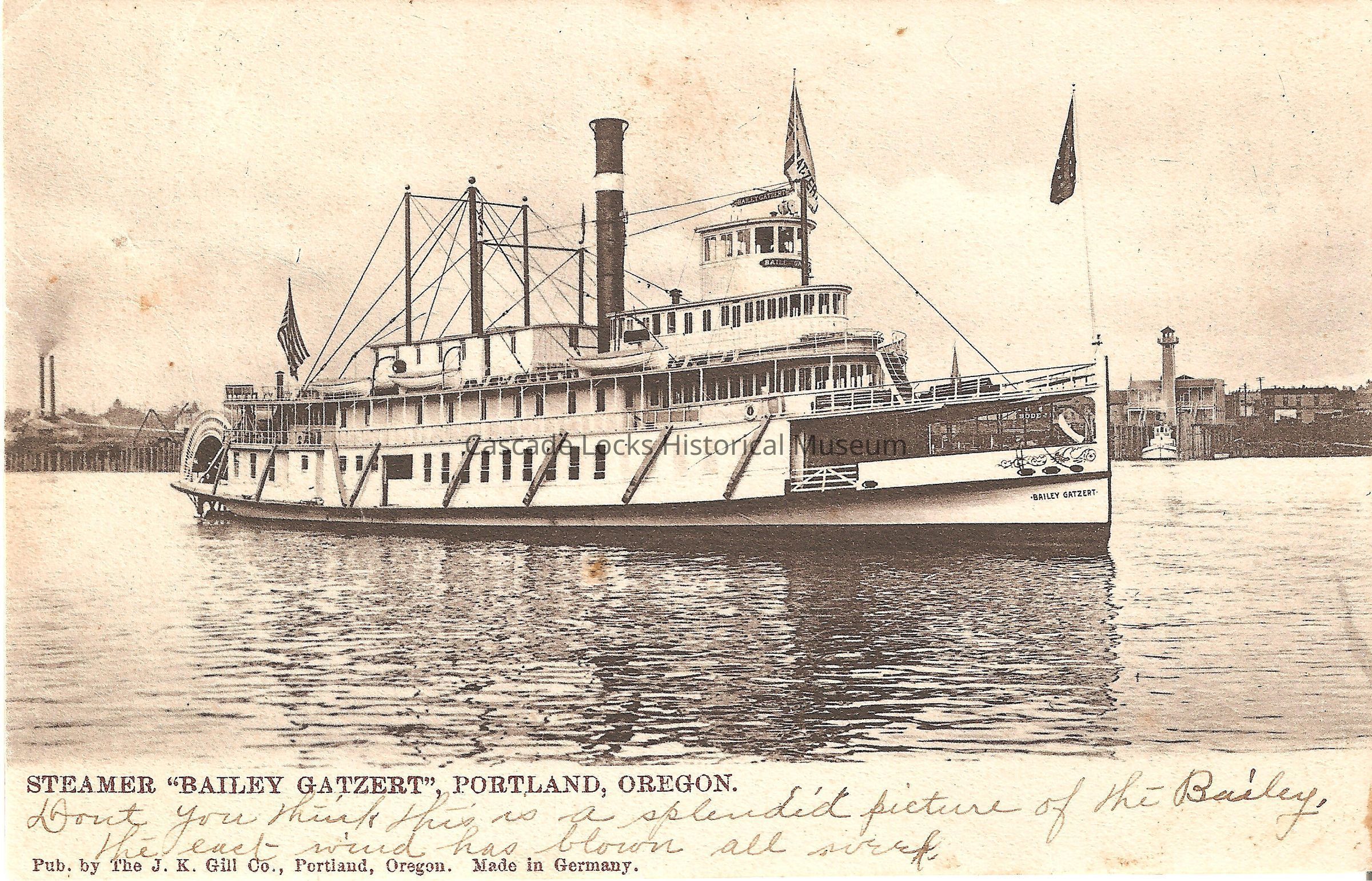 Postcard, image of the steamer the Bailey Gatzert. Bottom of card reads, "Steamer, Bailey Gatzert, Portland, Oregon. (Written) Don't you think this is a splendid picture of the Bailey, the east wind has blown all week. Pub. by the J. K. Gill co. Portland, Oregon. Made in Germany."