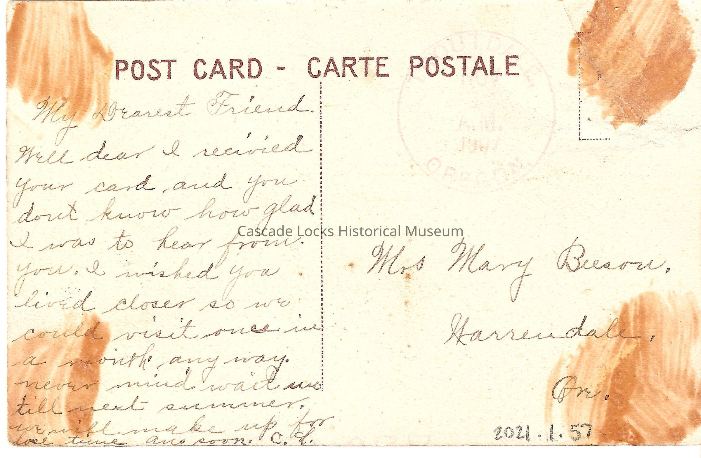 Back of image reads, "Post Card, Carte Postale. My dearest friend, well dear I received your card and you don't know how glad I was to hear from you. I wished you lived closer so we could visit once in a month, anyway. Never mind wait until next summer. We will make up for lost time. (?) soon. C.L. Mrs. Mary Buson, Warrendale, Or. Troutdale, Oregon. Nov 12, AM, 1907."Lexicon