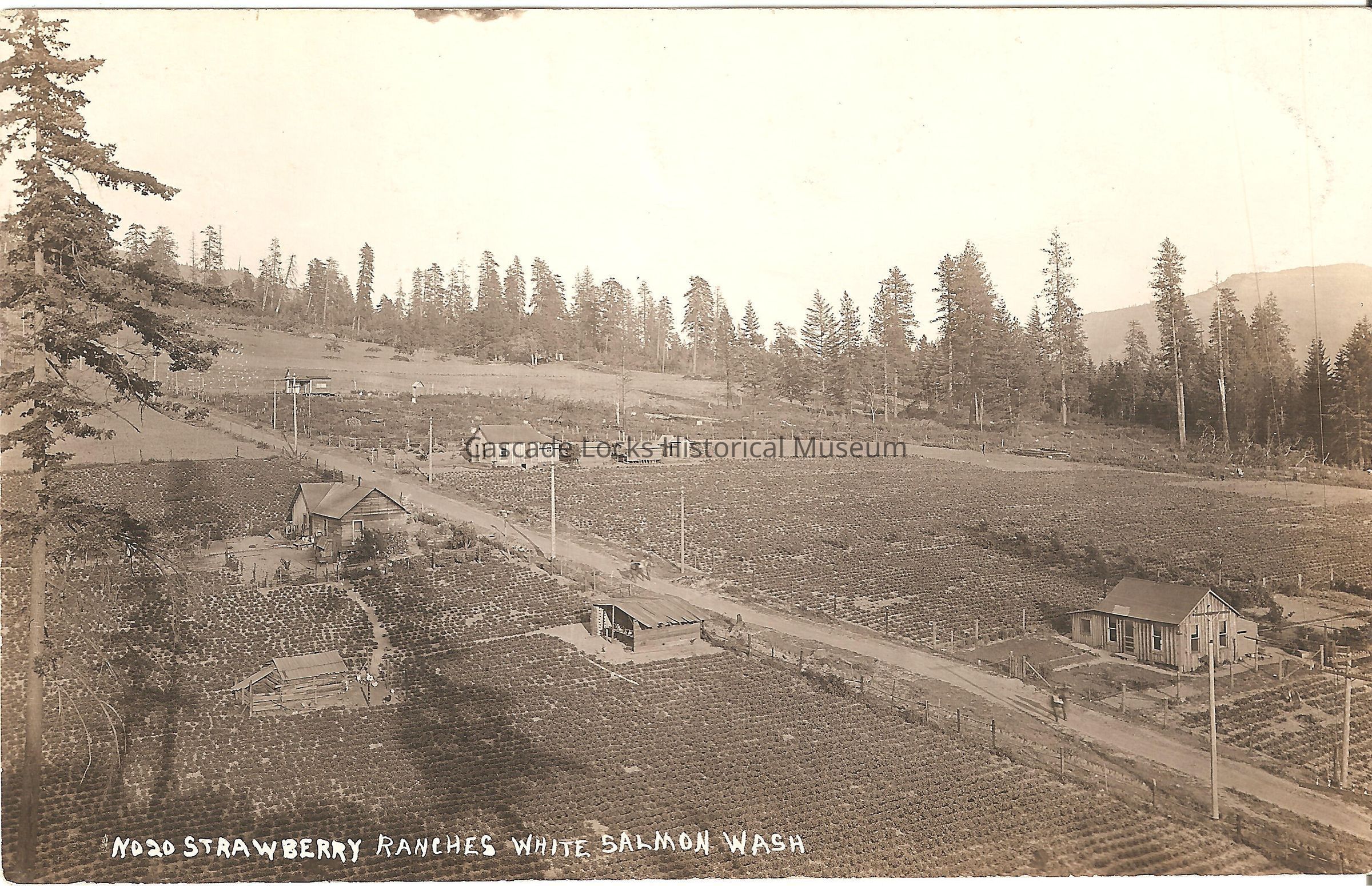 Postcard, image of the strawberry ranches in White Salmon, Washington. Card reads, "No. 20 Strawberry Ranches, White Salmon, Wash."