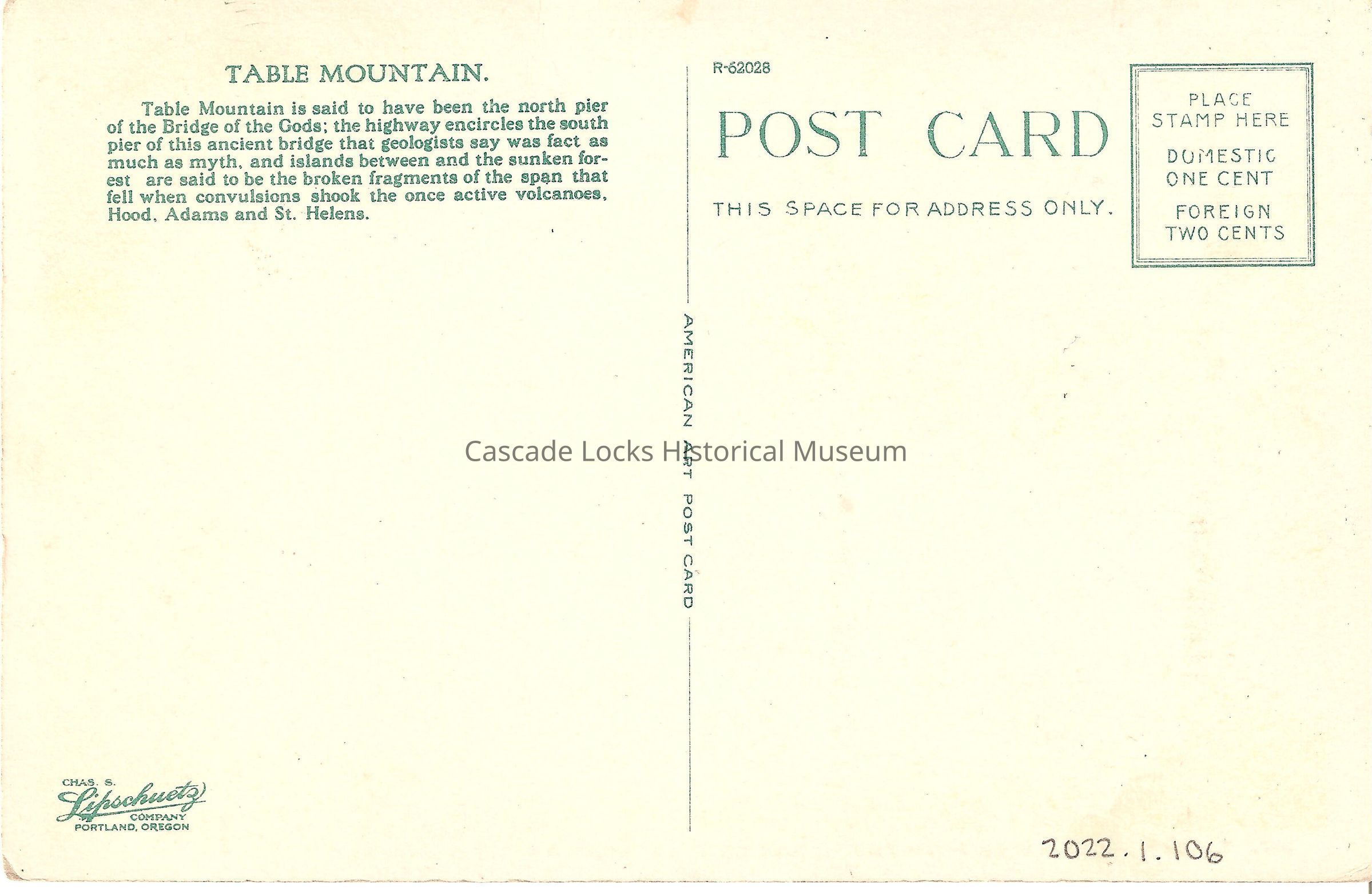 Back of image reads, "Post Card. Table Mountain. Table Mountain is said to have been the north pier of the Bridge of the Gods; the highway encircles the south pier of this ancient bridge that geologists say was fact as much as myth, and islands between and sunken forest are said to be the broken fragments of the span that fell when convulsions shook the once active volcanoes, Hood, Adams and St. Helens. This Space For Address Only. Chas. S. Lipschuetz Company. Portland, Oregon. R-62028. American Art Post Card. Place Stamp Here, Domestic One Cent, Foreign Two Cents."Lexicon