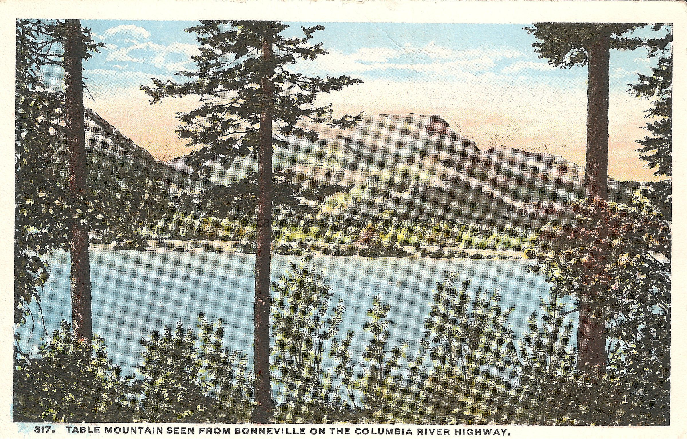 Postcard, photochrome image of Table Mountain from Bonneville. Card reads, "317. Table Mountain seen from Bonneville on the Columbia River Highway."