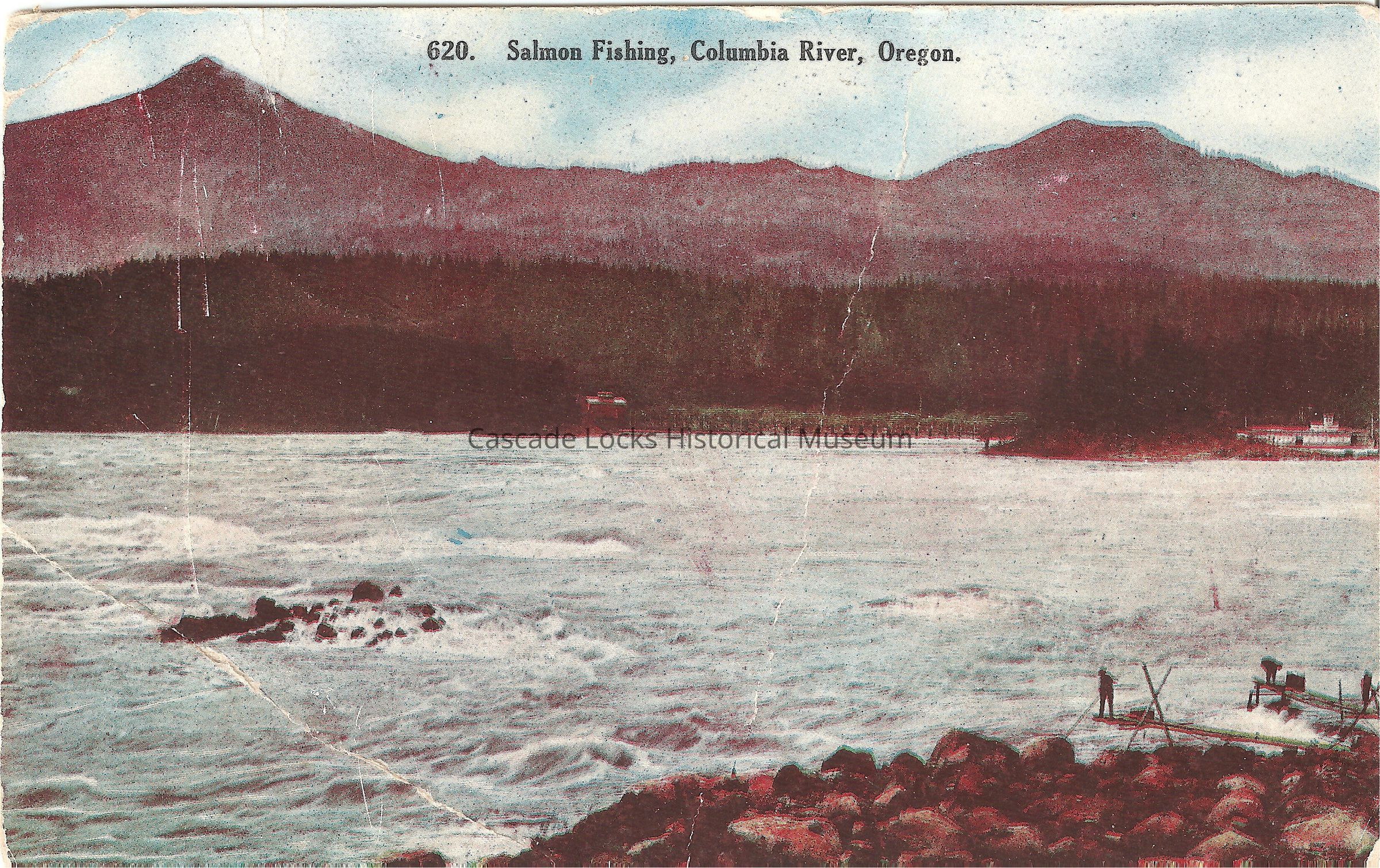 Postcard, image of Table Mountain, the Cascade Rapids and people fishing off docks on the bank. The top of the card reads, "620. Salmon Fishing, Columbia River, Oregon."