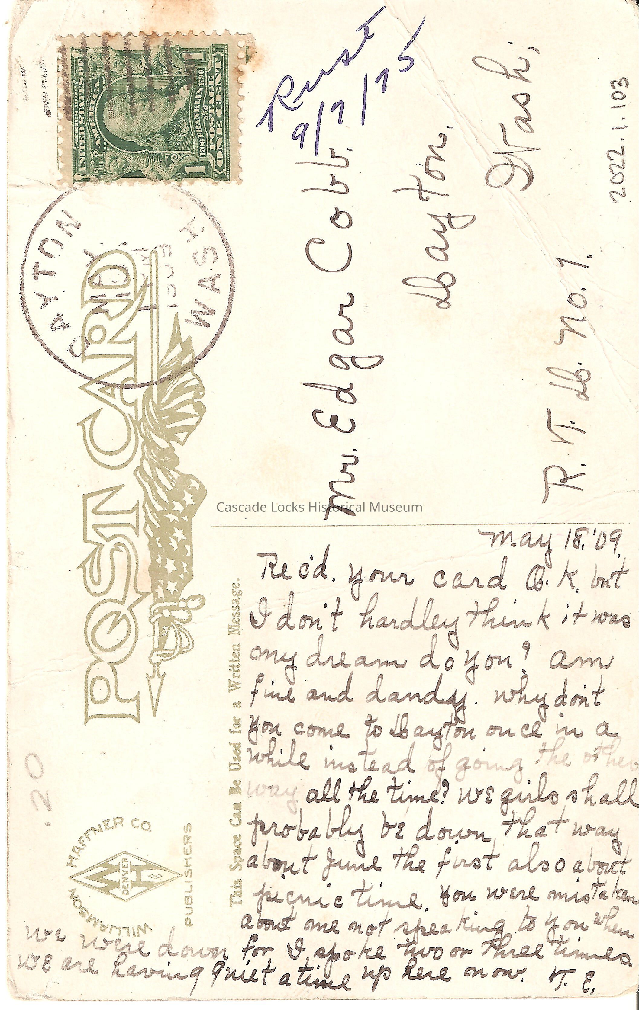 Back of image reads, "Post Card. This Space Can Be Used for a Written Message. May 18, (19)'09, Re'cd your card O.K. but I don't hardly think it was my dream do you? Am fine and dandy. Why don't you come to Dayton once in a while instead of going the other way all the time? We girls shall probably be down that way about June the first also about picnic time. You were mistaken about me not speaking to you when we were down for I spoke two or three times. We are having quiet a time up here now. T.E. (To) Mr. Edgar Cobb, Dayton, Wash. R.T.H. No.1. Dayton, Wash. May 19, 1PM, 1909. United States of America 1706-1790 Franklin, Postage One Cent (Stamp). Williamson Maffner Co. Publishers. (donated) Rust 9/7/(19)75."Lexicon