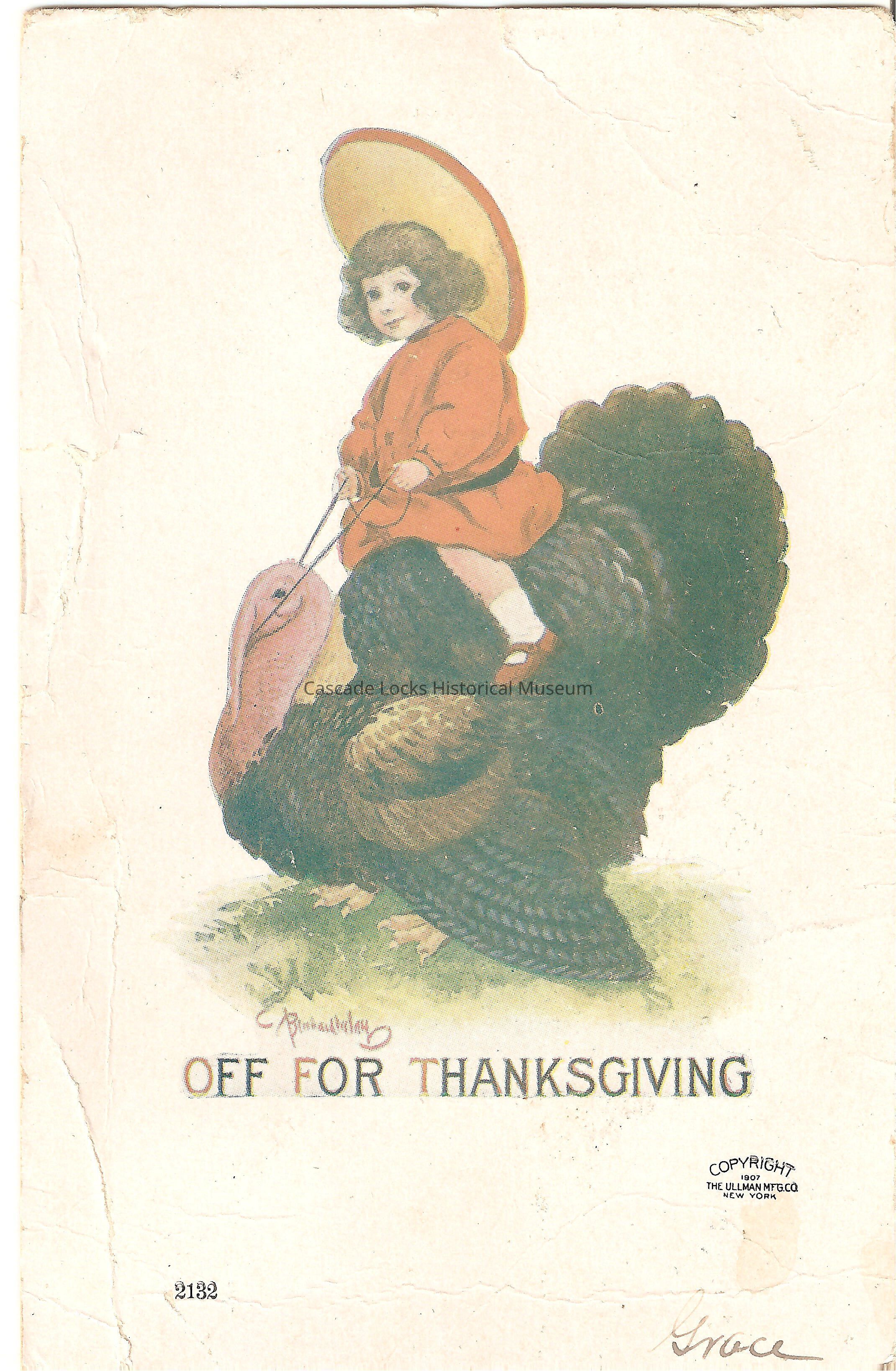 Post Card, illustrated image of a young child in a red dress riding a turkey. The base of image reads, "Off For thanksgiving. Copywrite 1907, The Ullman MTG. CO. New York. 2132. (Signed) Grace."