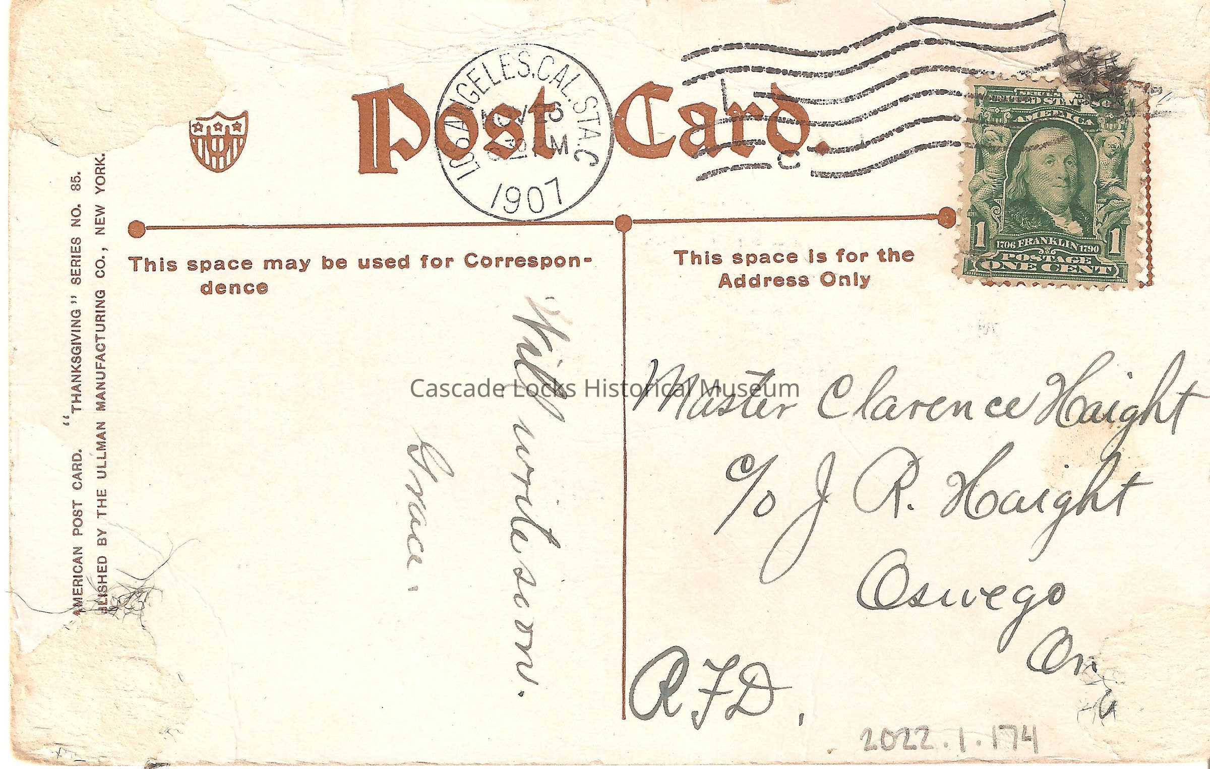 Back of image reads, "Post Card. This space may be used for Correspondence- Will write soon-Grace. This space is for the Address only- Master Clarence Haight c/o J. R. Haight, Oswego, Oreg. R.F.D. American Post Card. "Thanksgiving" Series no. 85. Published by the Ullman Manufacturing Co, New York. Los Angeles STA C. Nov 26, 630PM, 1907. United States of America 1706-1790 Franklin, Postage One Cent (Stamp)"Lexicon