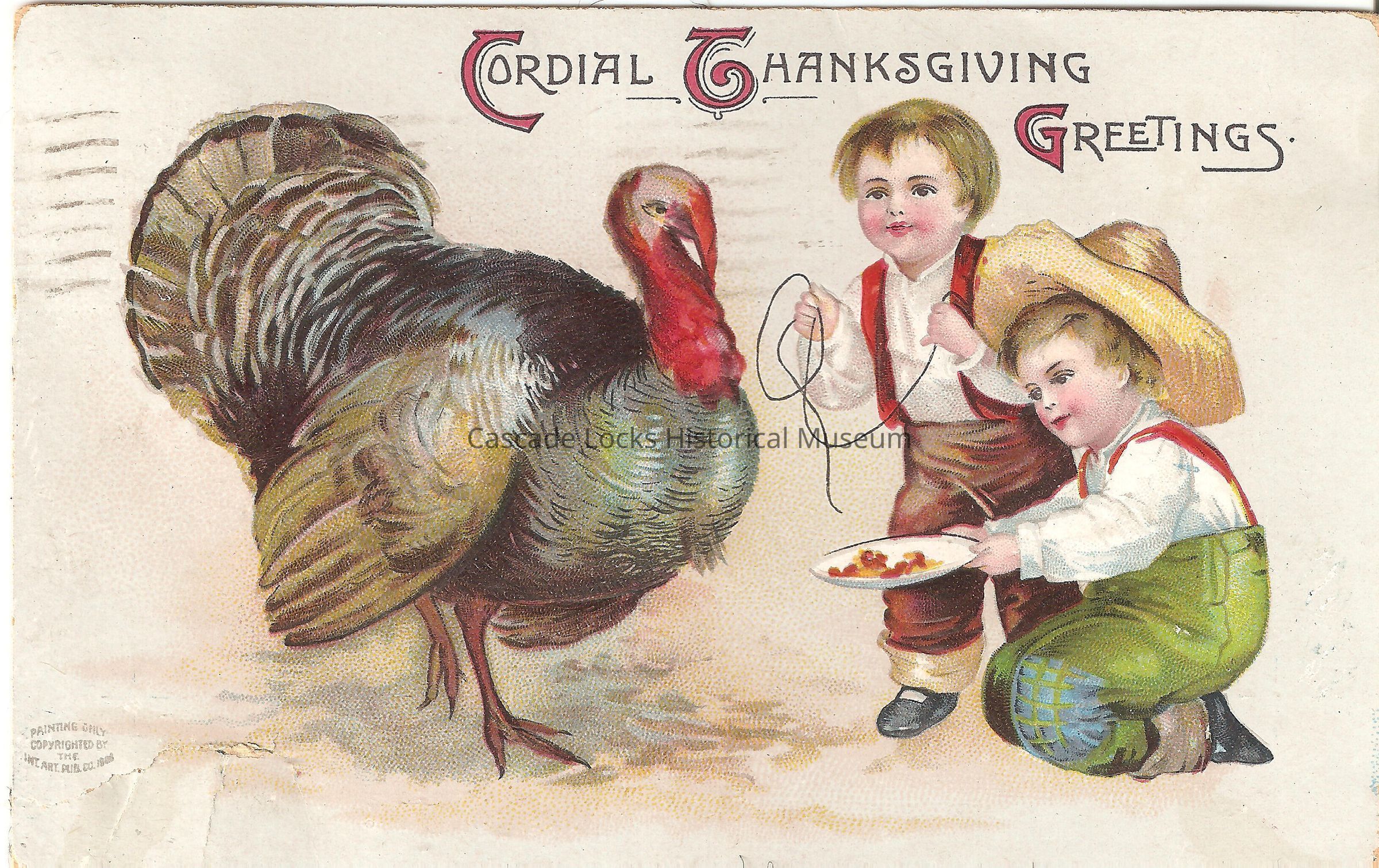 Post Card, illustrated image of a two children trying to lasso a turkey using food to lure the turkey closer. Top of image reads, "Cordial Thanksgiving Greetings. Painting Only copywrite by the INT. Art PUB. Co. 1908."