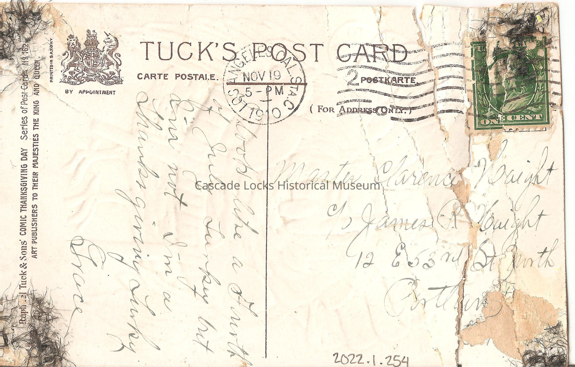 Back of image reads, "Tucks post card. Raphael Tuck & Sons' Comic Thanksgiving day. Series of Post Cards N9 162 Art Publishers to their Majesties the King and Queen, Printed in Saxony (Germany). By Appointment. Carte Postai. E. Postkarte, For Address Only. Los Angeles Cal. STA. C 1910. Nov 19. 5-PM. Looks like a Fourth of July turkey but I'm not, I'm a Thanksgiving turkey -Grace. Martha Clarence Haight c/o James R Haight 12 E 53rdSt. North Portland."Lexicon