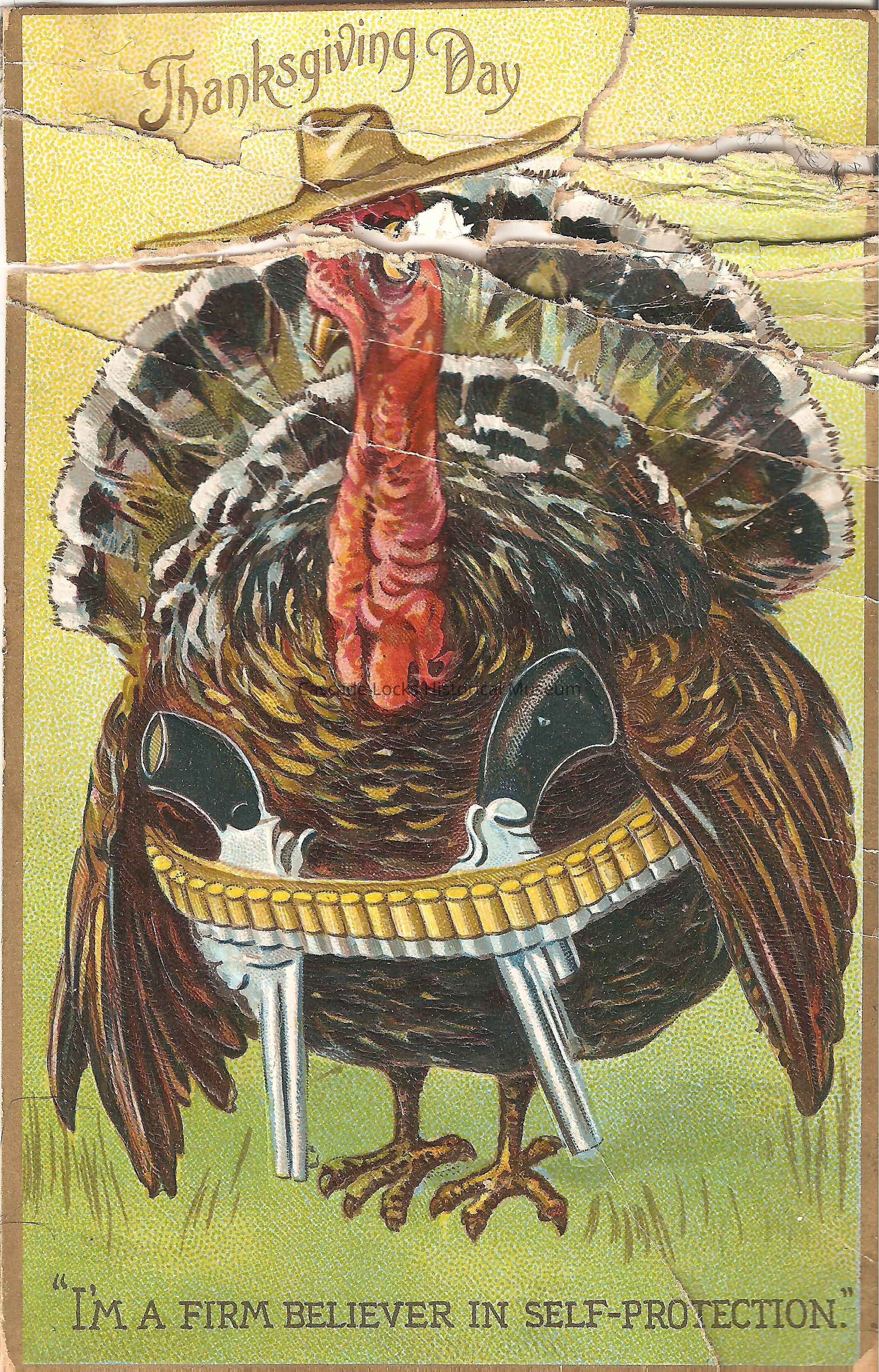 Post Card, illustrated image of a turkey wearing a brimmed hat, a bandolier, and two revolver pistols. Top of post card front says, "Thanksgiving day" and bottom reads, "I'm a form believer in self protection."