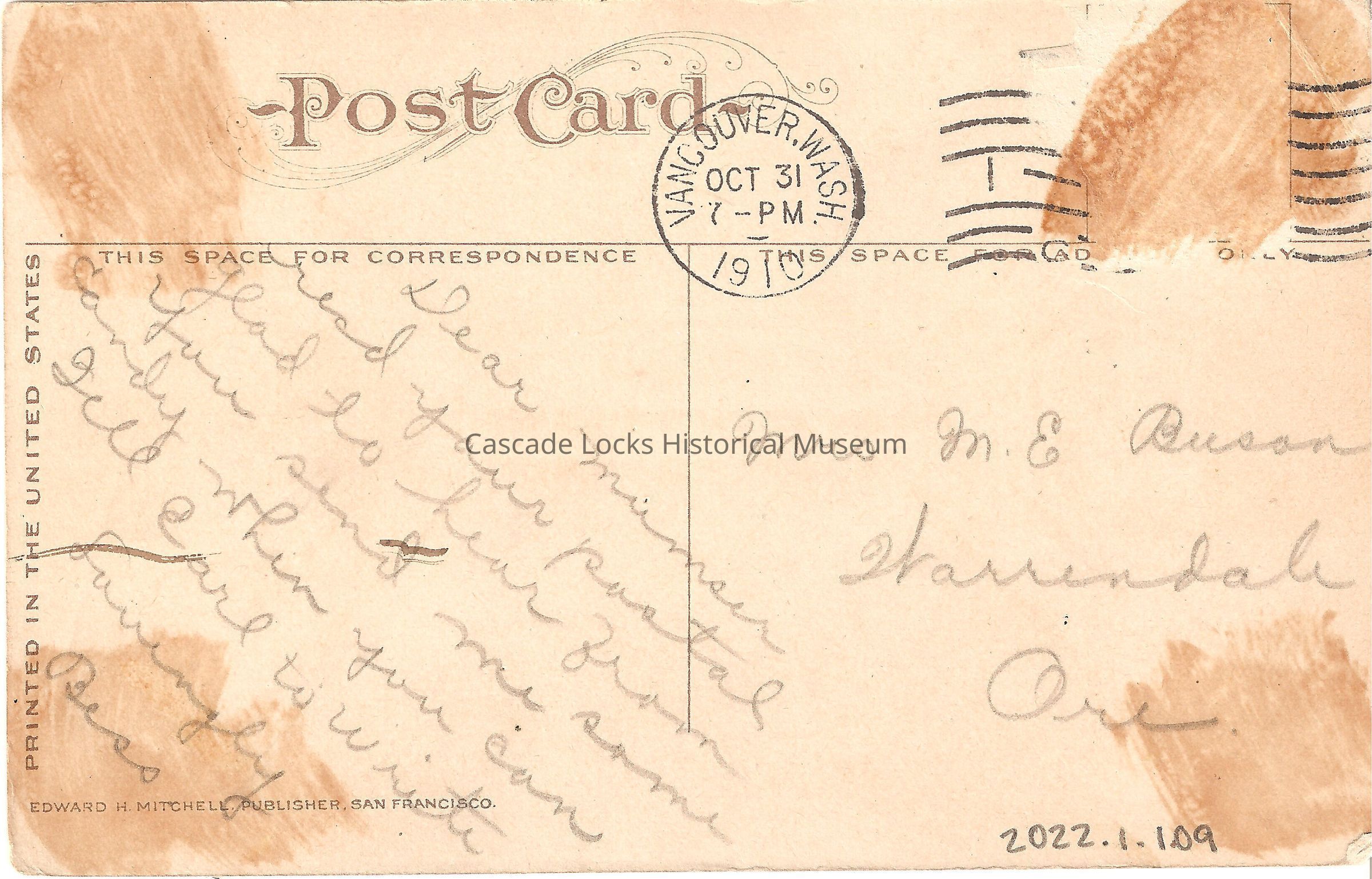 Back of image reads, "Post Card. This Space for Correspondence- Dear Mumser, Read your postal, glad you hear from you send me some candy when you can, tell Carl to write, Bess. This Space For Address Only- Mrs. M. E. Buson, Warrendale, Ore. Printed in the United States. Edward H. Mitchell. Publisher, San Francisco. Vancouver, Wash. Oct 31, 7PM, 1910."Lexicon