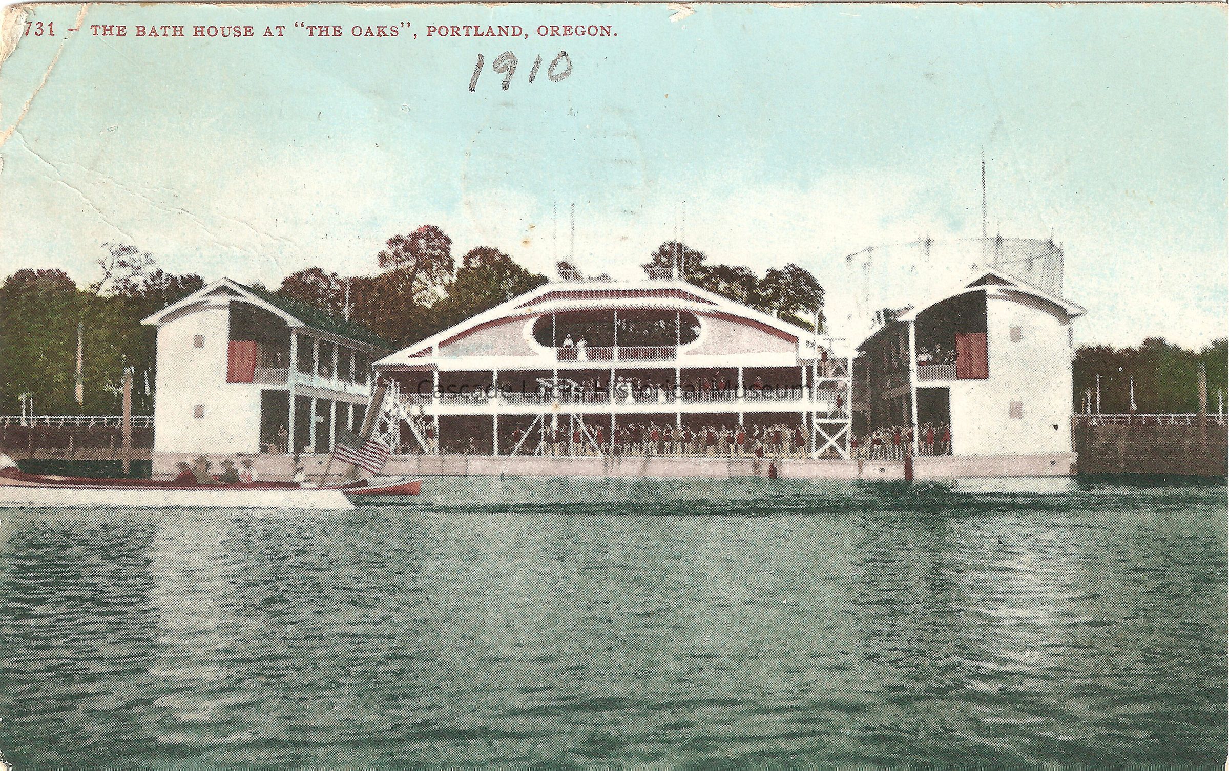 Postcard, photochrome image of the Bath House at The Oaks. The top right corner of the card reads, "731- The Bath House At "The Oaks," Portland, Oregon."