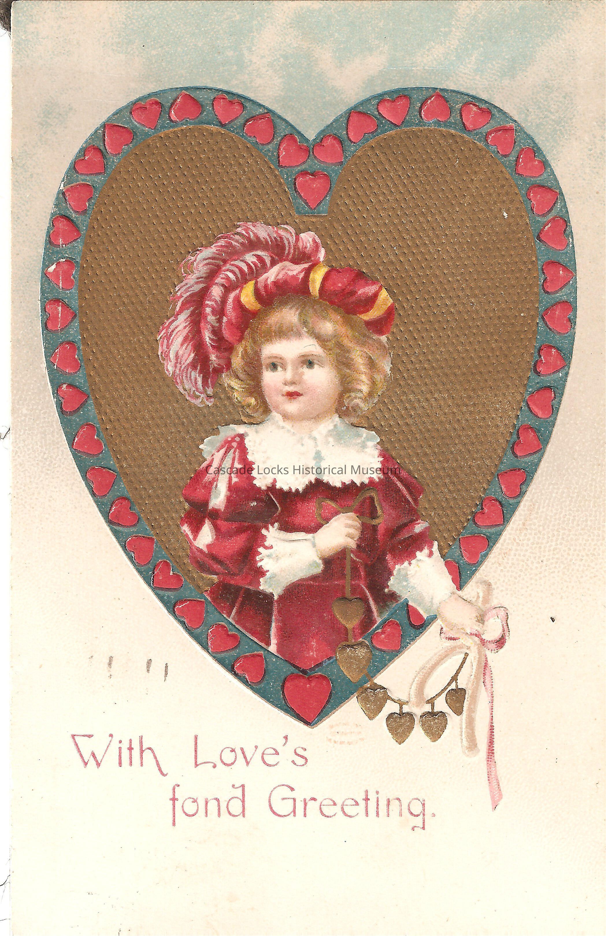 Post Card, illustrated image of a young child dressed ornately in a coat, collar, and hat with feathers holding a string of gold hearts. Base of card reads, "With Love's fond Greeting."