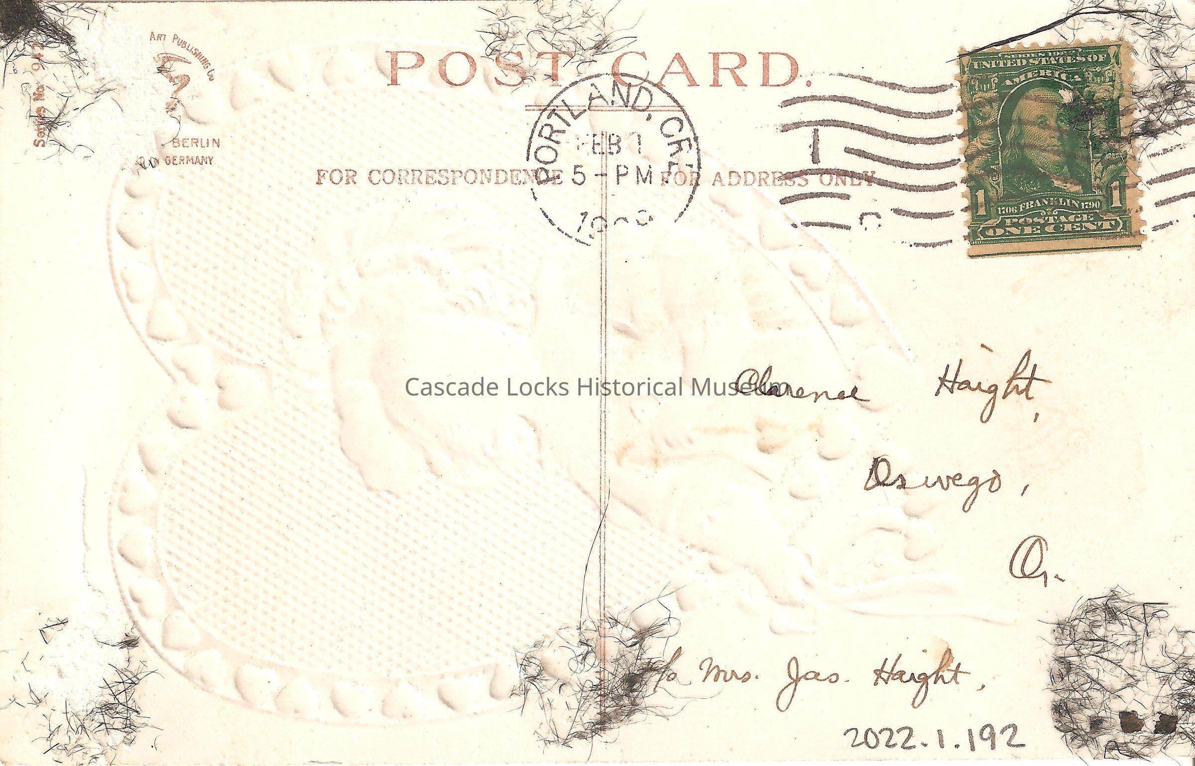Back of image reads, "Post Card- For Correspondence. For Address Only- Clarence Haight, Oswego, OR. c/o Jas. Haight. International Art Publ. Co. New York, Berlin. Printed in Germany. Series No. Portland, Ore. Feb 1, 5PM, 19(?). United States of America 1706-1790 Franklin, Postage One Cent (Stamp)."Lexicon