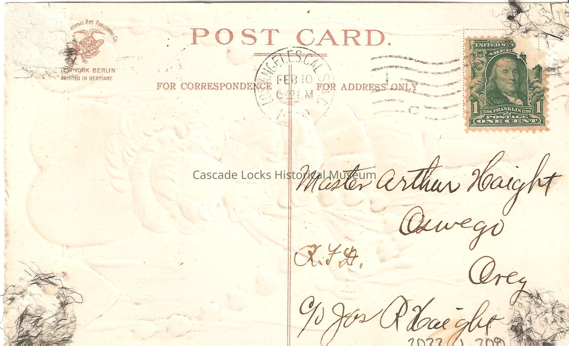 Back of image reads, "Post Card- For Correspondence-. For Address Only- Master Arthur Haight, Oswego, Oreg. R.F.D. c/o Jas. R. Haight. Los Angeles Cal. Feb 10 6-30 19-. International Art Publ. Co. New York, berlin. Printed in Germany. United States of America 1706-1790 Franklin, Postage One Cent (Stamp)."Lexicon