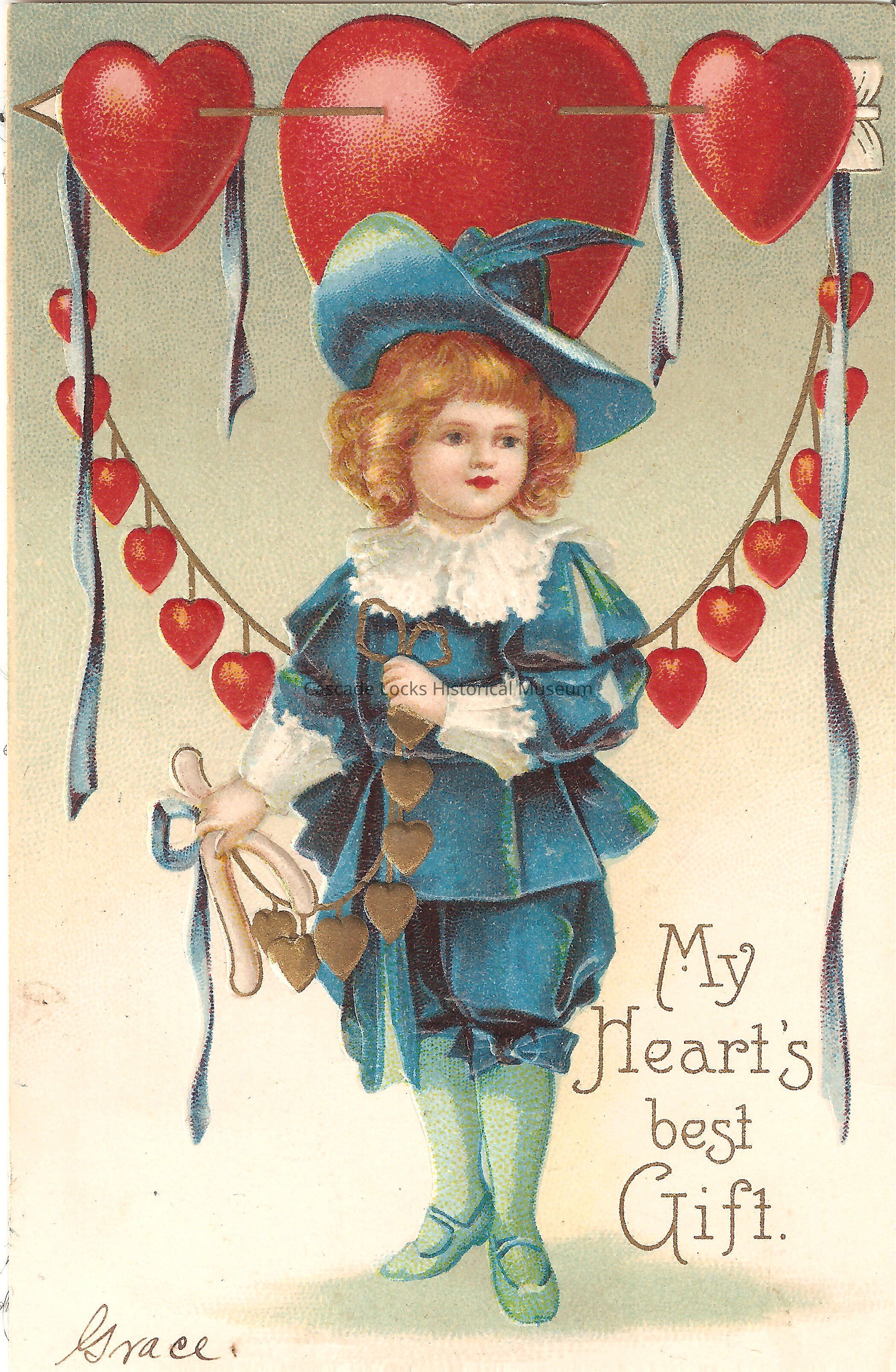 Post Card, illustrated image of a young child dressed ornately in a coat, breeches, stockings, high heels, collar, and hat with feathers holding a string of gold hearts. Base of card reads, "My Hearts best Gift. (signed) Grace."