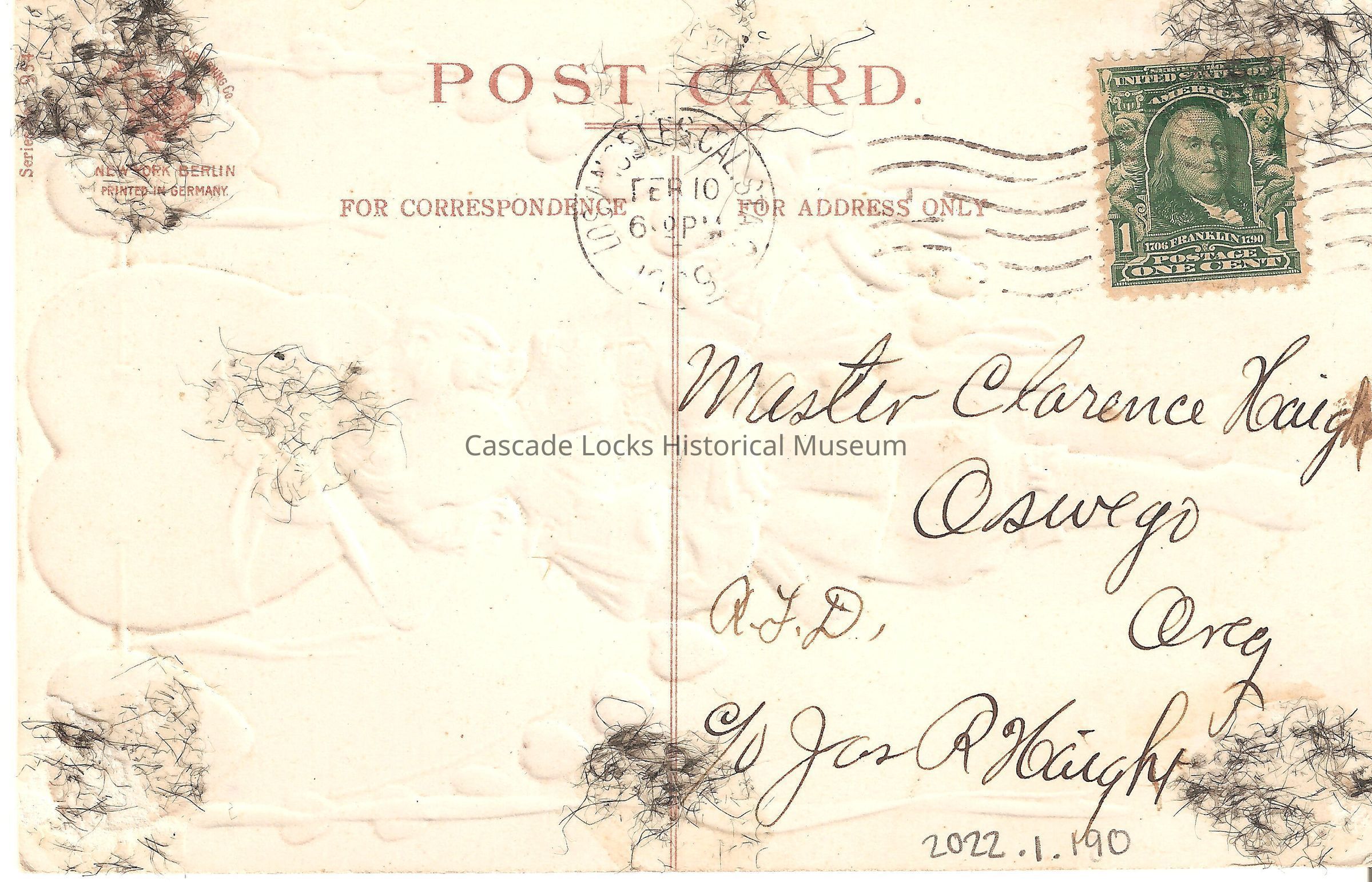 Back of image reads, "Post Card- For Correspondence- For Address Only- Master Clarence Haight, Oswego, OR. R.F.D. c/o J. R. Haight. International Art Publ. Co. New York, Berlin. Printed in Germany. Series 954. Los Angeles STA C. Feb 10, 6PM, 1909. United States of America 1706-1790 Franklin, Postage One Cent (Stamp)."Lexicon