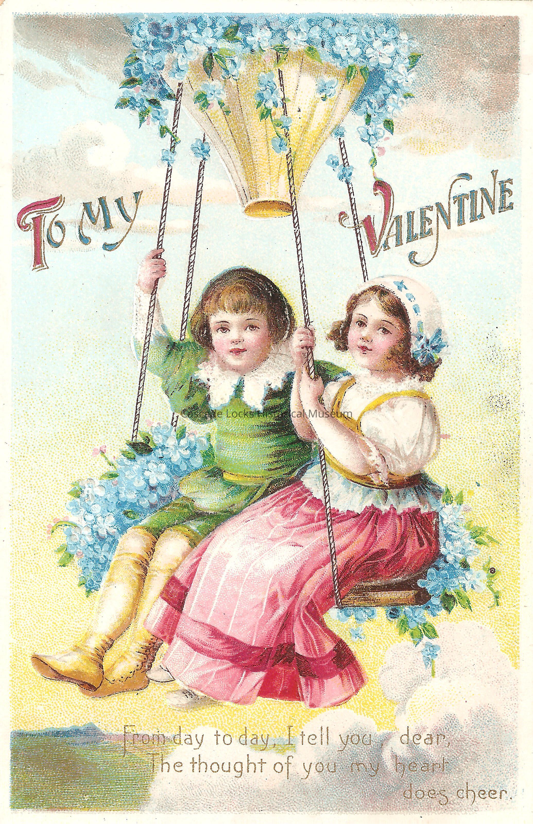 Post Card, illustrated image of two children sitting on a swing attached to a hot air balloon with the landscape below them. The swing and the balloon are covered in blue flowers. the card reads, "To My Valentine, from day to day, I tell you, dear, The thought of you my heart does cheer."