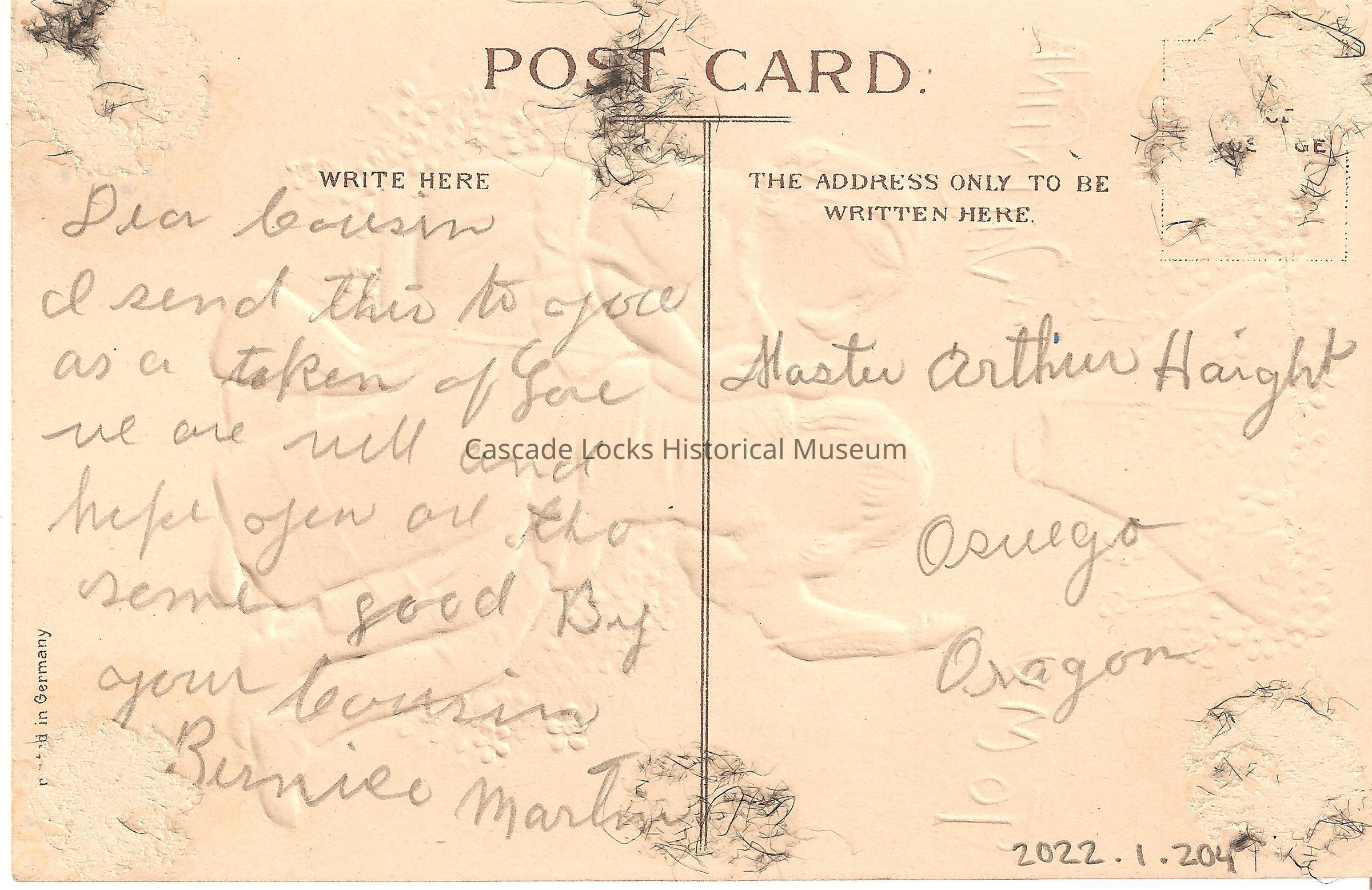 Back of image reads, "Post Card- Write Here- Dear Cousin, I send this to you as a token of love. We are well and hope you are the same, good. By your cousin, Bernice Mailin.-For Address Only To Be Written Here- Master Arthur Haight, Oswego, Oregon. Printed in Germany."Lexicon