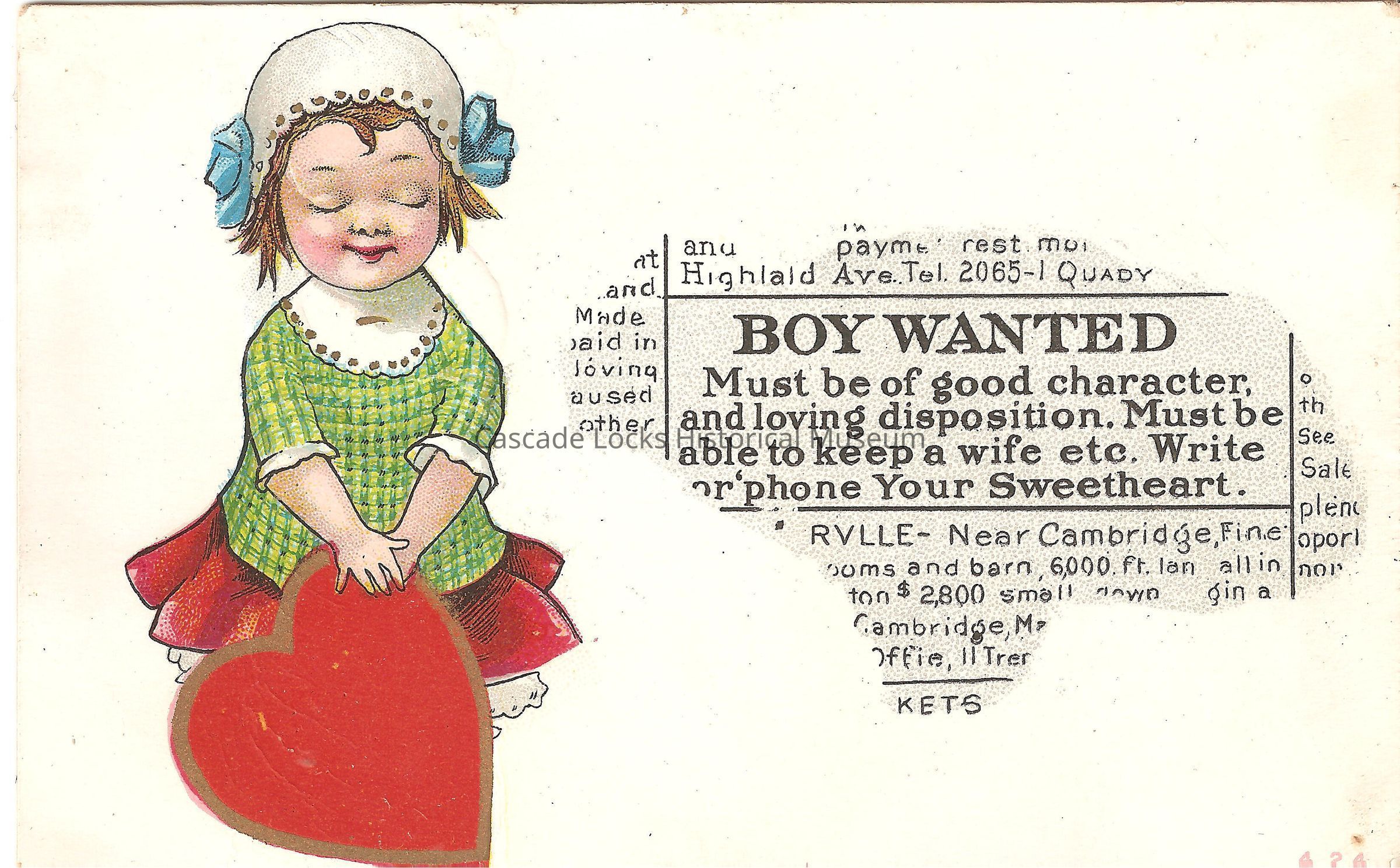 Post Card, illustrated image of a young girl holding a heart. The right middle of the card reads, "Boy Wanted- Must be of good character, and loving disposition. Must be able to keep a wife etc. Write or phone- your Sweetheart."