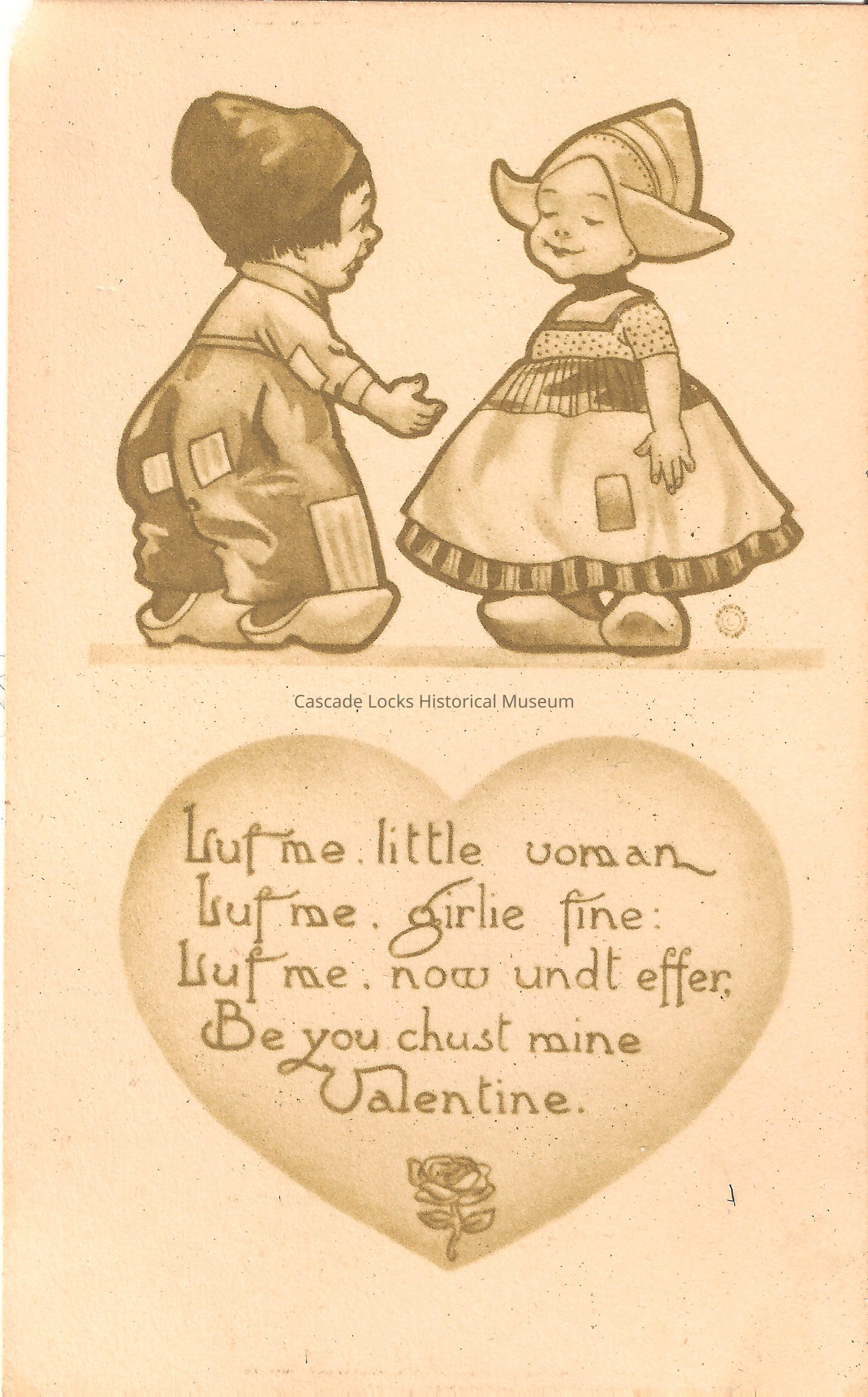 Post Card, illustrated image of two Dutch children in traditional clothing interacting with each other. Below them is a heart with a saying inside that reads, "Lut me, little woman. Luf me, girlie fine: Lut me, now undt effer. Be you chust mine Valentine."