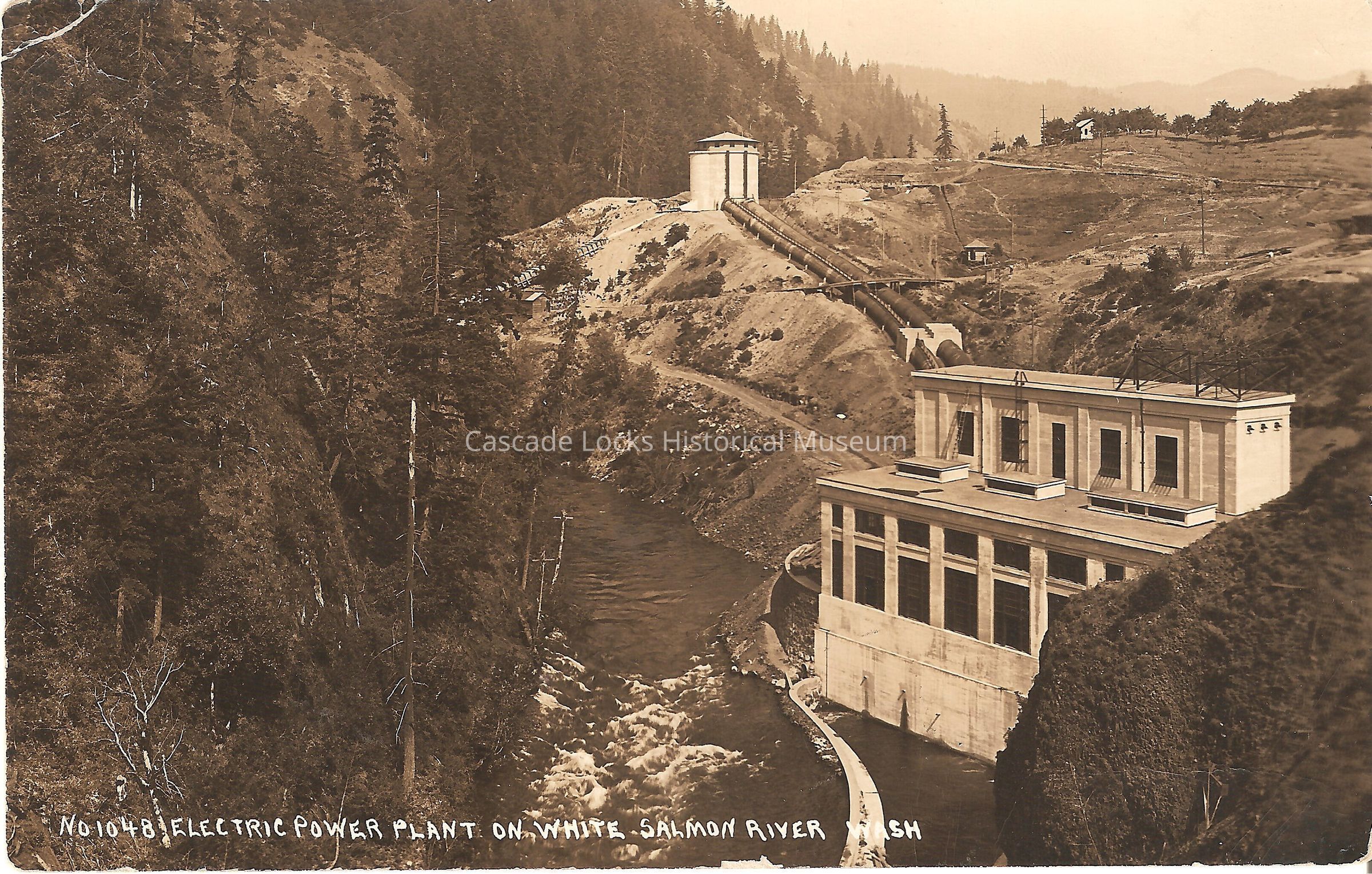 Postcard, image of a power plant on the white salmon river in Washington. Card reads, "No 1048 Electric Power Plant on White Salmon River, Wash."