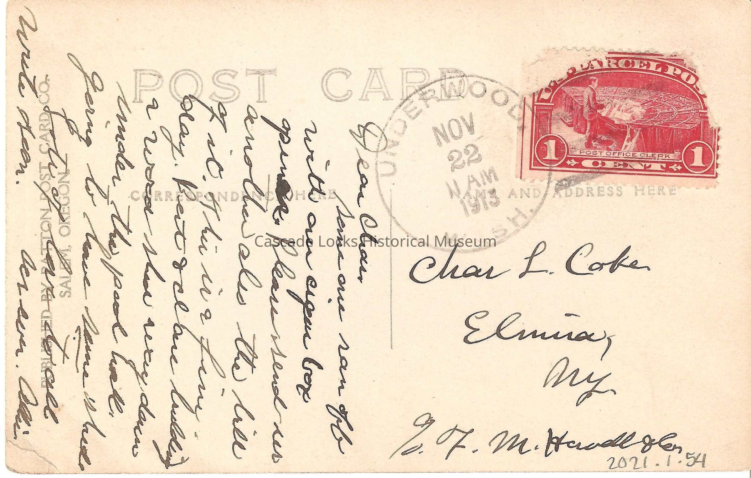 Back of image reads, "Post Card. Correspondence- Dear Chas, someone ran off with an cigar box opener. Please send us another also the bill of it. This is a fine day. Bert & CL are building a wood (?) down under the pool hall. Going to have some (?). Lots of love to all. Write soon. (?) Allie. And Address Here- Chas L. Cake, Elmira NY. c/o F. M. Harrell Glen. Underwood, Wash. Nov 22, 11AM, 1913. U.S. Parcel Post, Post Office Clerk, 1 Cent. Published by Patton Post Card Co. Salem, Oregon."Lexicon