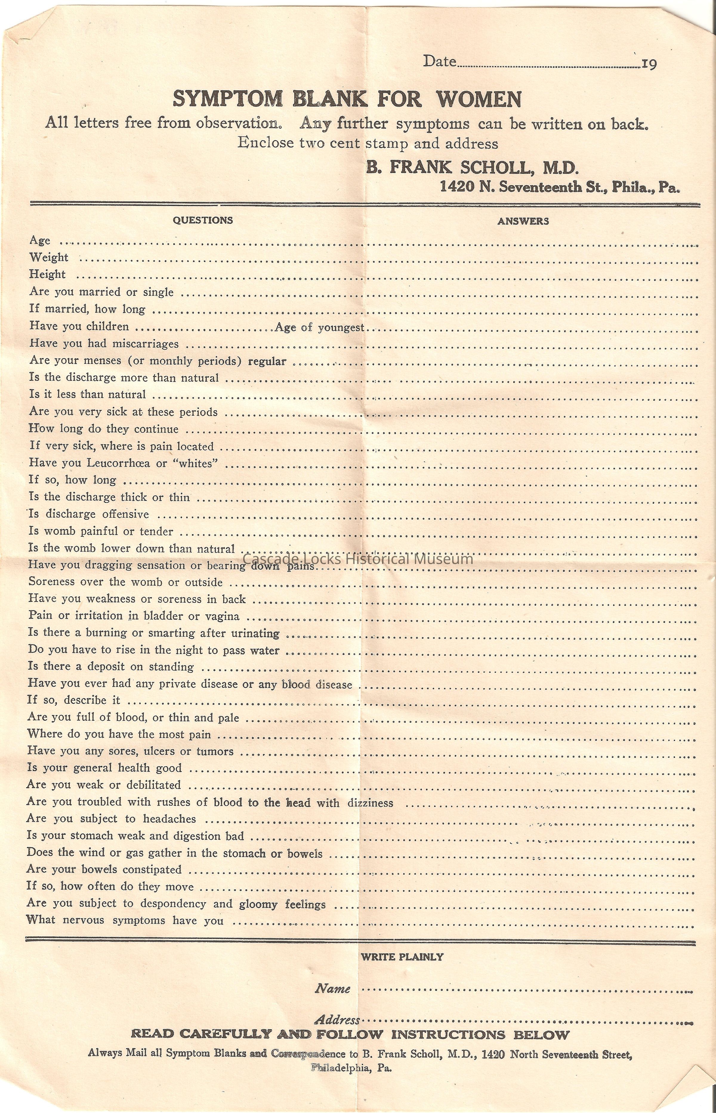 Write plainly Name__ Address__ Read carefully and follow instructions below. Always mail all symptoms Blanks and correspondence to B. Frank Scholl, M.D. 1420 North Seventeenth Street, Philadelphia, Pa.